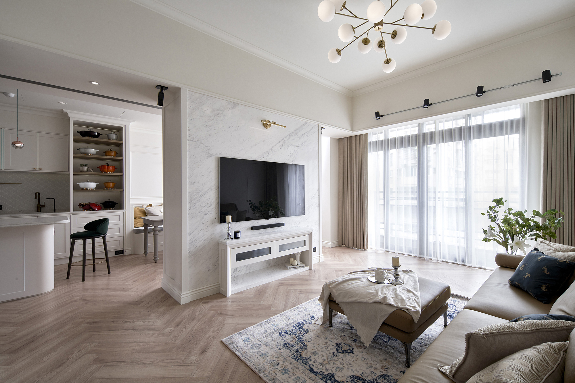 為了確保公領域的穿透感,彭總監運用了歐式空間設計常見的手法-以電視牆量體,打造出回字型動線,藉以提升整體的開放性;設置電視牆除了讓居家表情更顯立體、定義出場域功能之外,還增加後方餐廳區的收納量,更重要的是成就設計的第2項重點-採光。回字型動線不只打開空間,同時還串連出客廳、餐廳以及主臥房三處無隔間的長型通道,當日光灑入屋內時,擁有整排採光的唯美長廊,隨即產生歐式居家氛圍的既視感,並讓室外的光線能夠連續地、恣意地造訪室內,以達到採光最大化的程度。