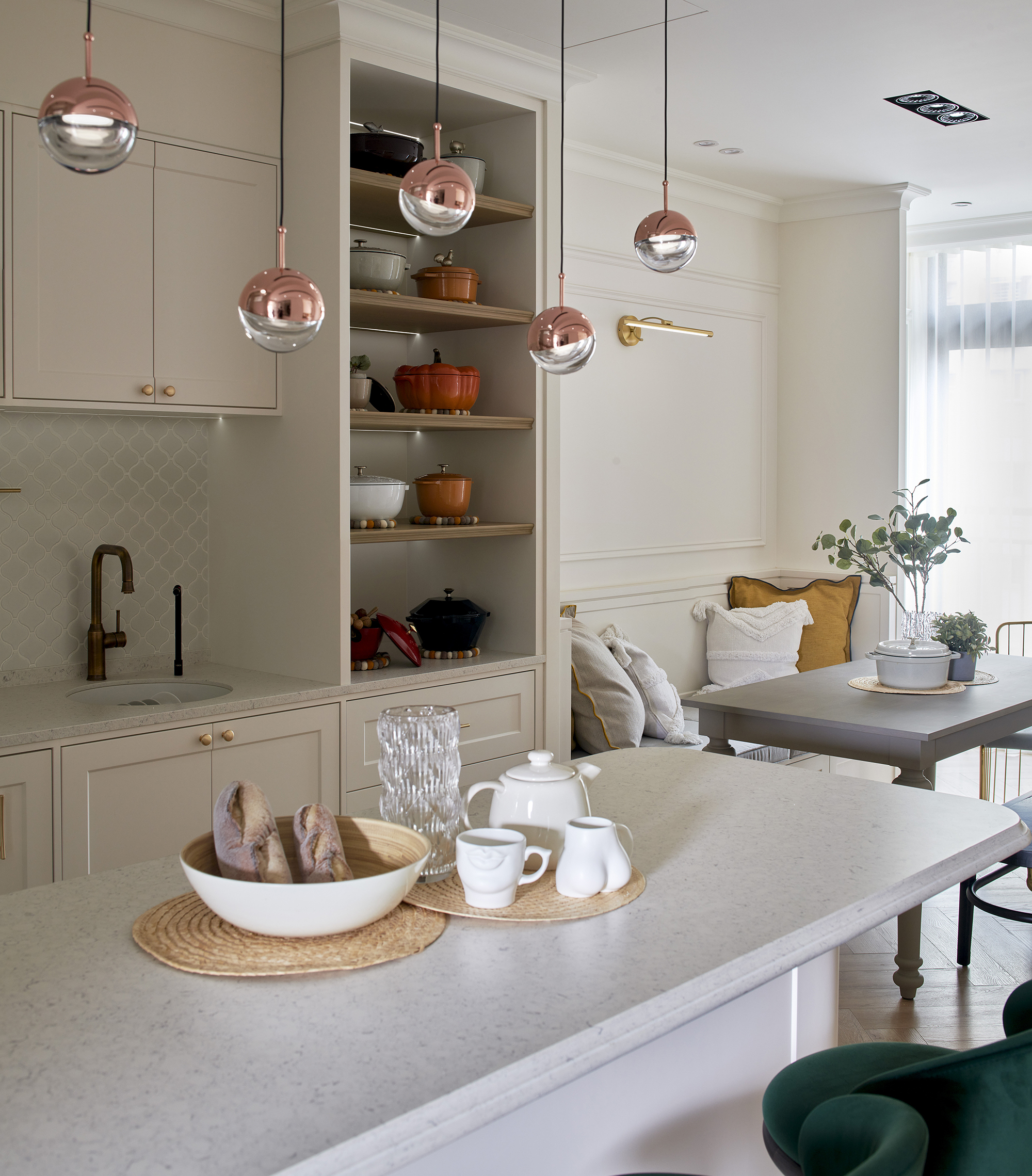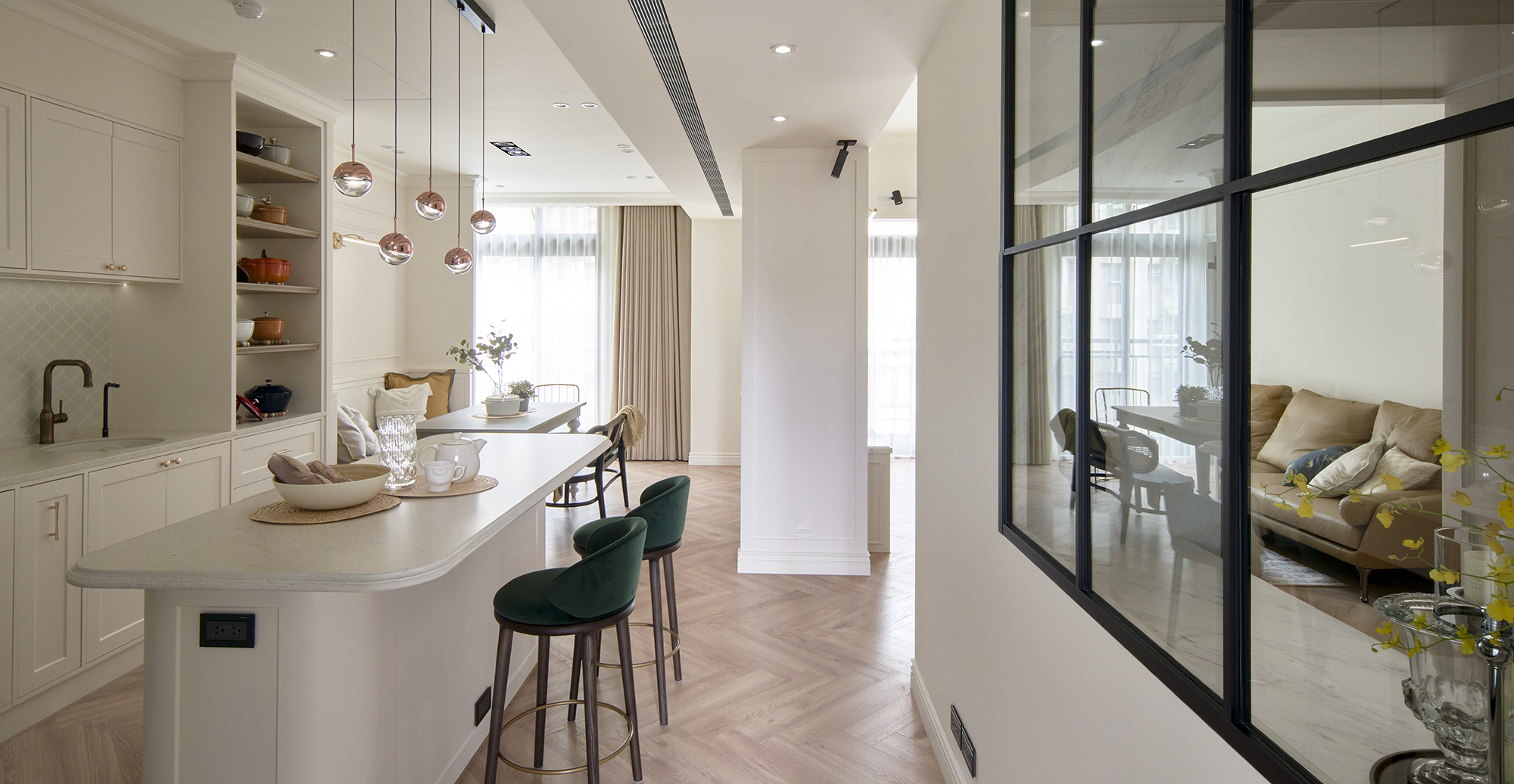 回應屋主的居住需求,彭總監統整出住家規劃的2大重點:中島與採光。女屋主希望能有獨立於熱炒區之外的中島輕食區,夢想於此處和孩子共享幸福的烹飪時光,因而定調出以中島輕食區為家庭重心的設計。位於一旁配有休閒風卡座沙發餐椅的餐廳區,不僅能與中島有極佳的互動,家人一進門還可透過大面格子窗,看到女屋主在中島準備輕食、點心,甚至是親友坐在客廳,也都能和位於中島的主人家順暢地交流、聊天。