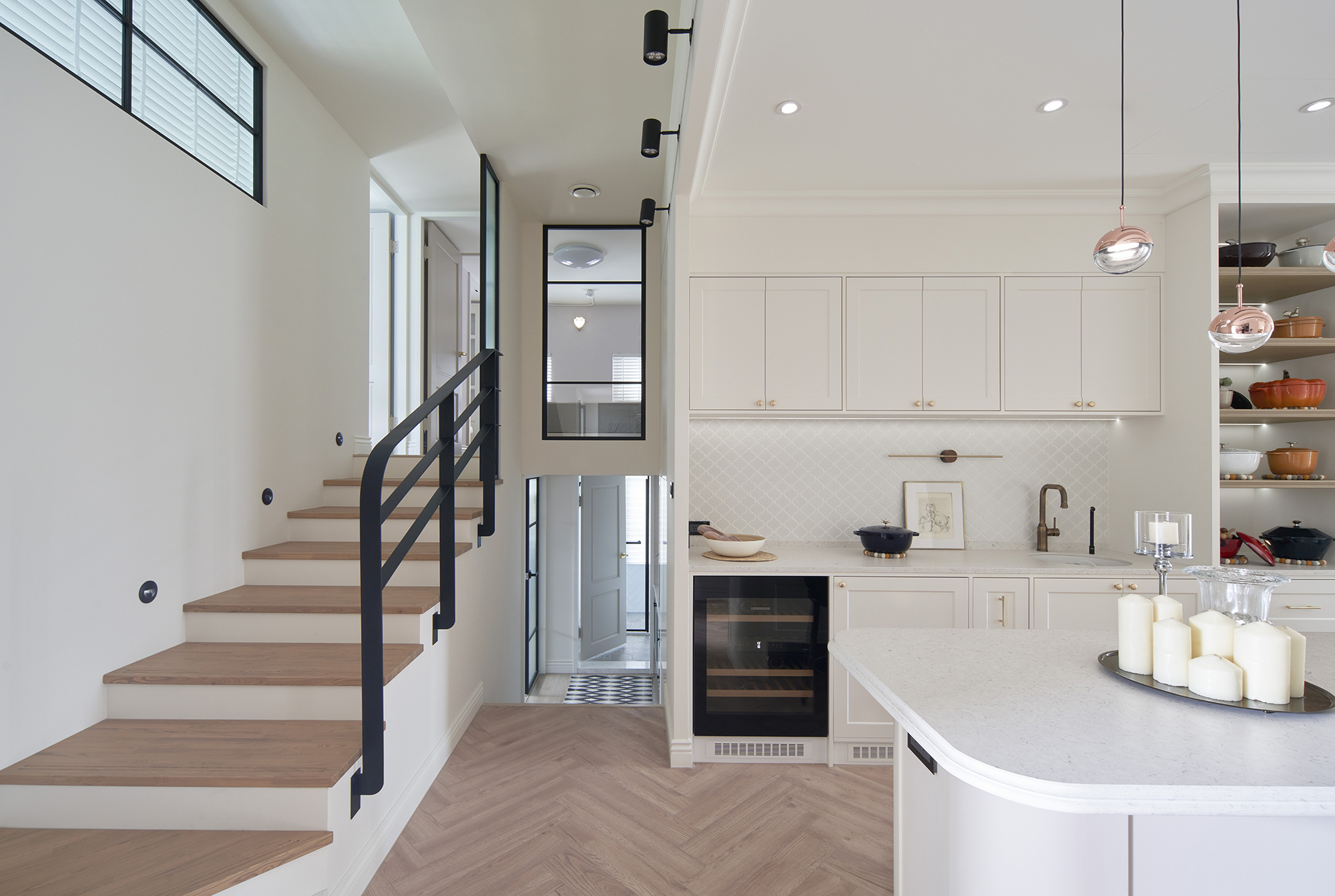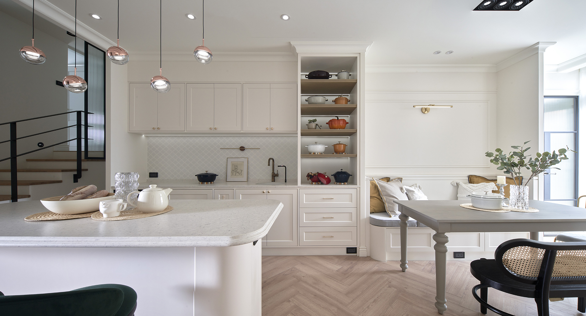 加上全室採用白色鋪底,全面提升視覺明亮度、通透性,佐以淺奶茶色、藍灰色、橄欖綠等柔適色彩,增添空間趣味感,當然還少不了元典設計經典的人字拼木地板、花磚元素,巧搭質感建材為居家品味畫龍點睛。此外,妥善運用挑高空間的複層設計,增取出最大坪效,為住家新增了書房兼客房的多功能臥室,協助屋主一家實現夢想中舒適、舒心的微美式居所。