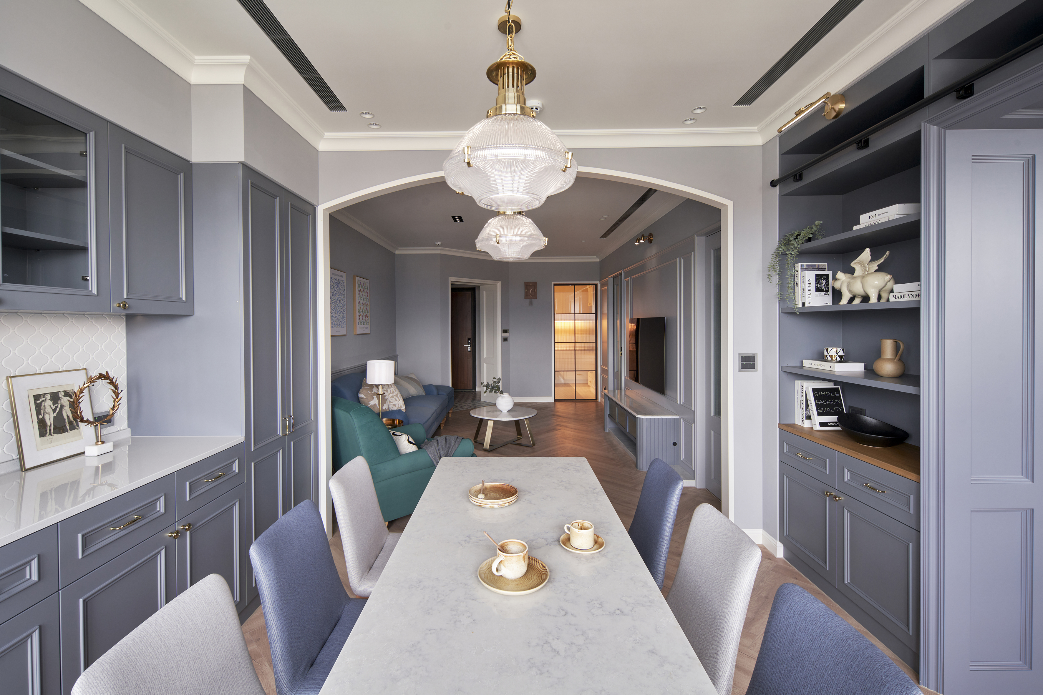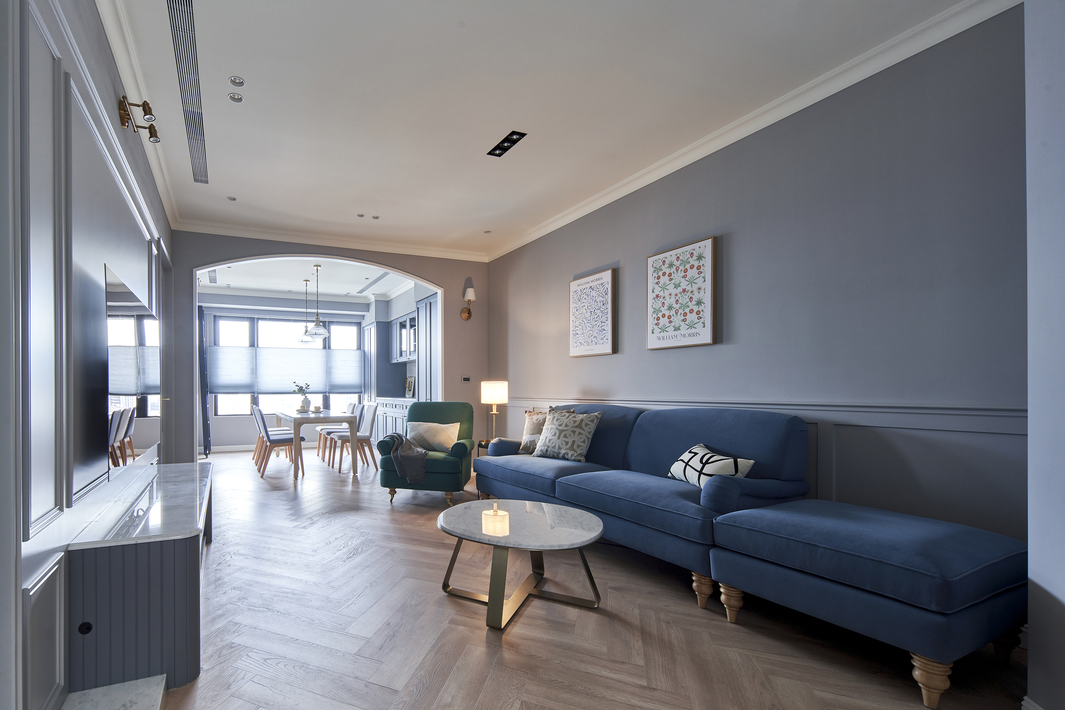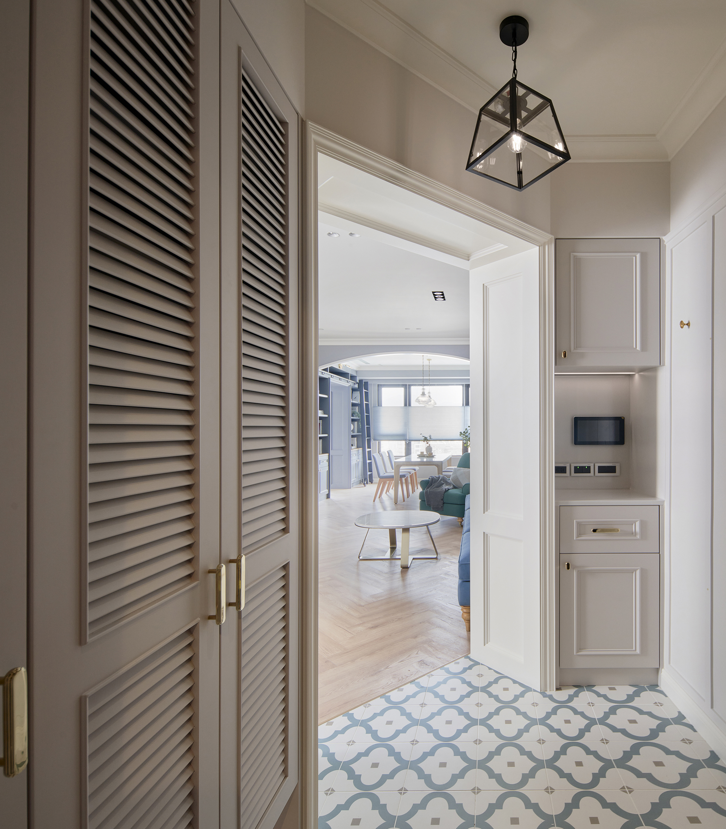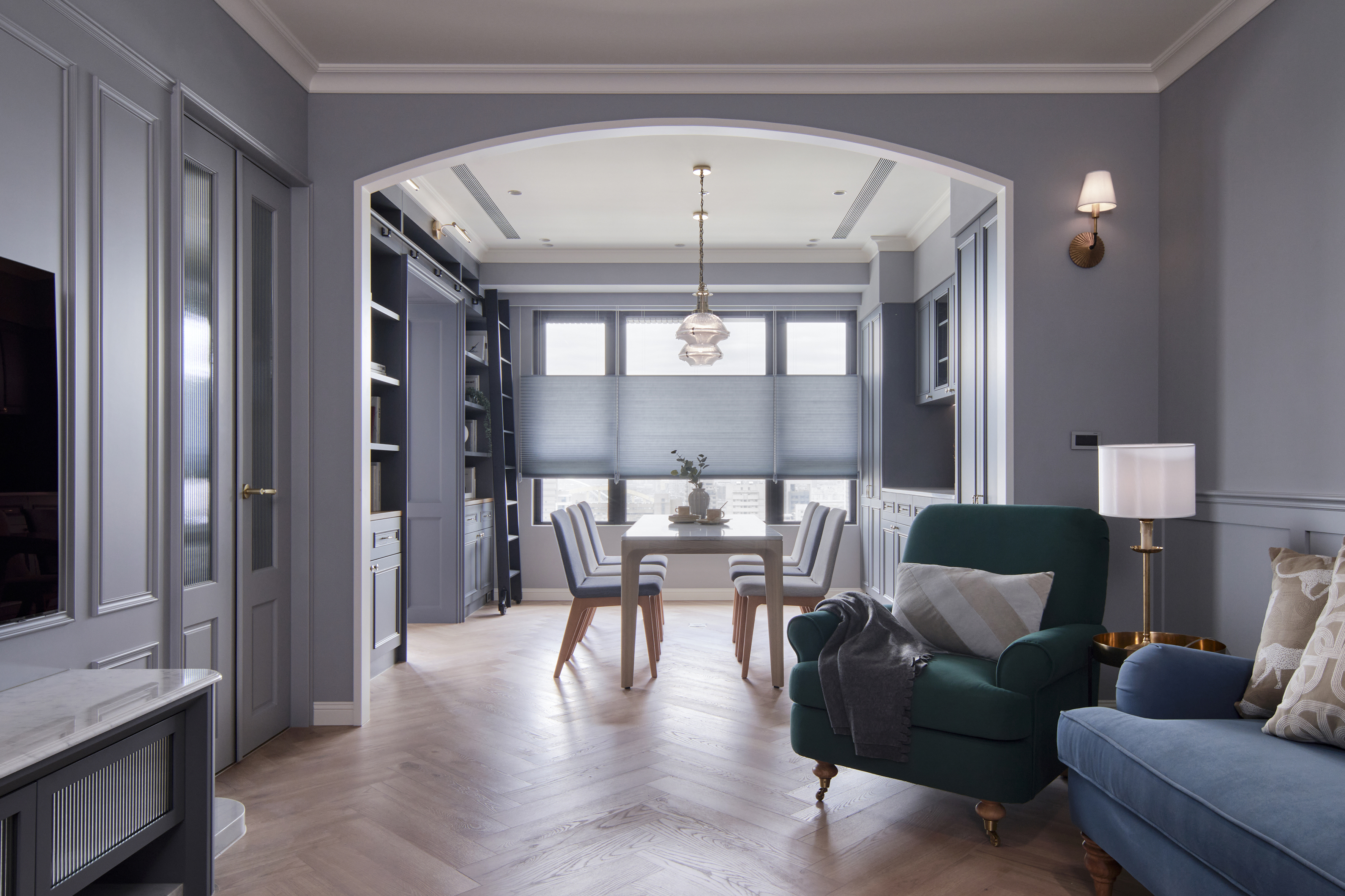 玄關鋪設進口花磚,結合穿衣鏡與鞋櫃機能十足,跳脫制式玄關設計,改採斜角ㄇ字型線性門框擴大場域,進出玄關能沉澱心情,儀式感油然而生,藉此揭開美式生活的序曲。公領域以白色、灰藍色和溫潤的人字拼木地板堆疊舒適溫馨感受,客廳與餐廳相連,加深縱向尺度,簡約線板勾勒出精緻的美式居家輪廓,穿過弧形門拱進入餐廳,窗邊景致遼闊,兩側規劃書牆與收納展示櫃,坪效超放大,穿過玻璃鐵件拉門進入書房,雙人長書桌與窗邊加長型臥榻,讓屋主兩人一起閱讀或放空都輕鬆自在,在柔和色調圍塑的無壓書房,享受彼此的陪伴。