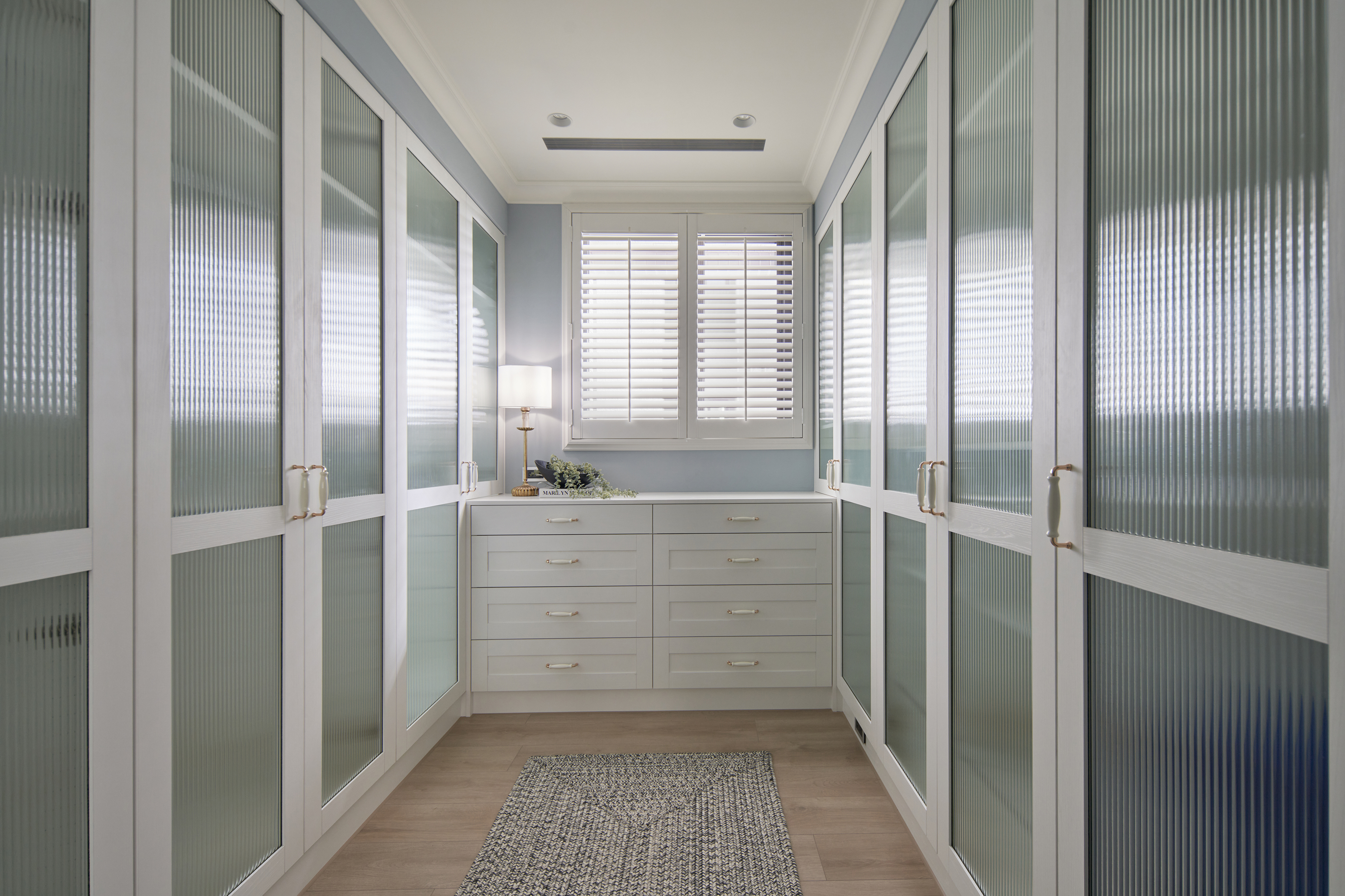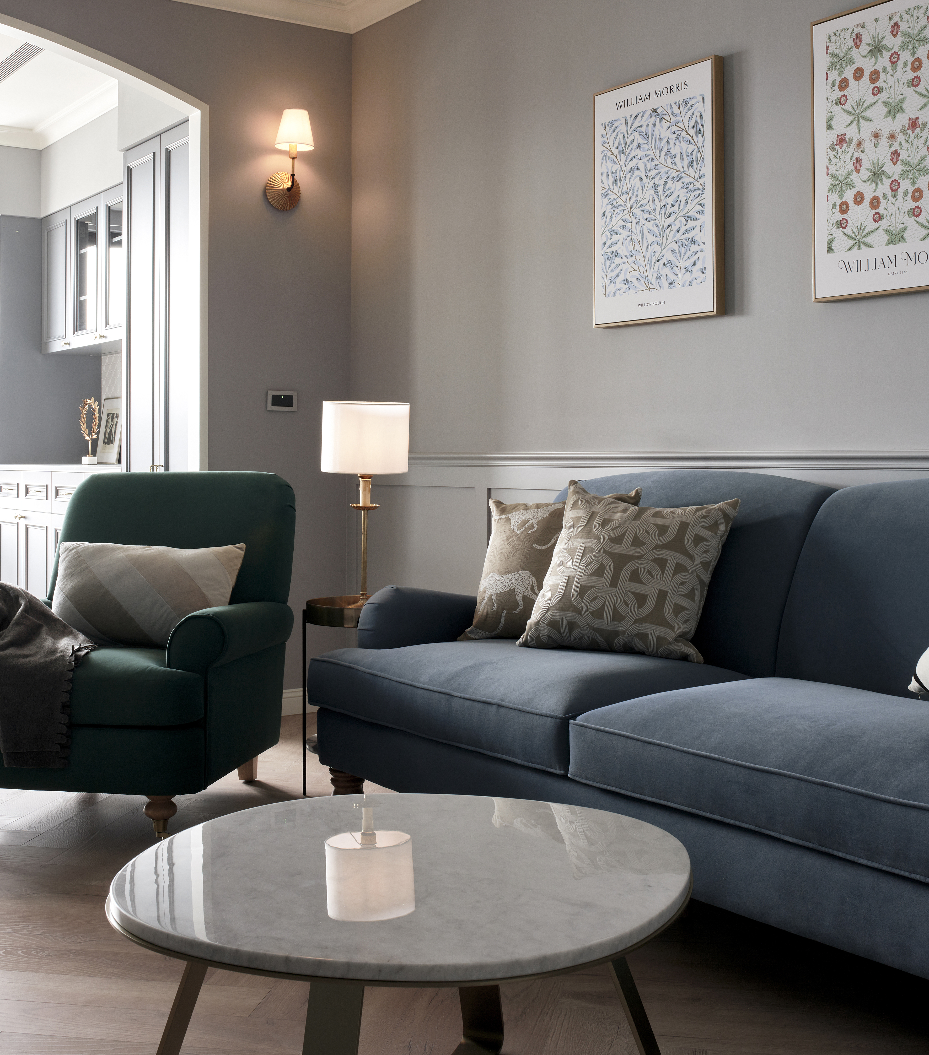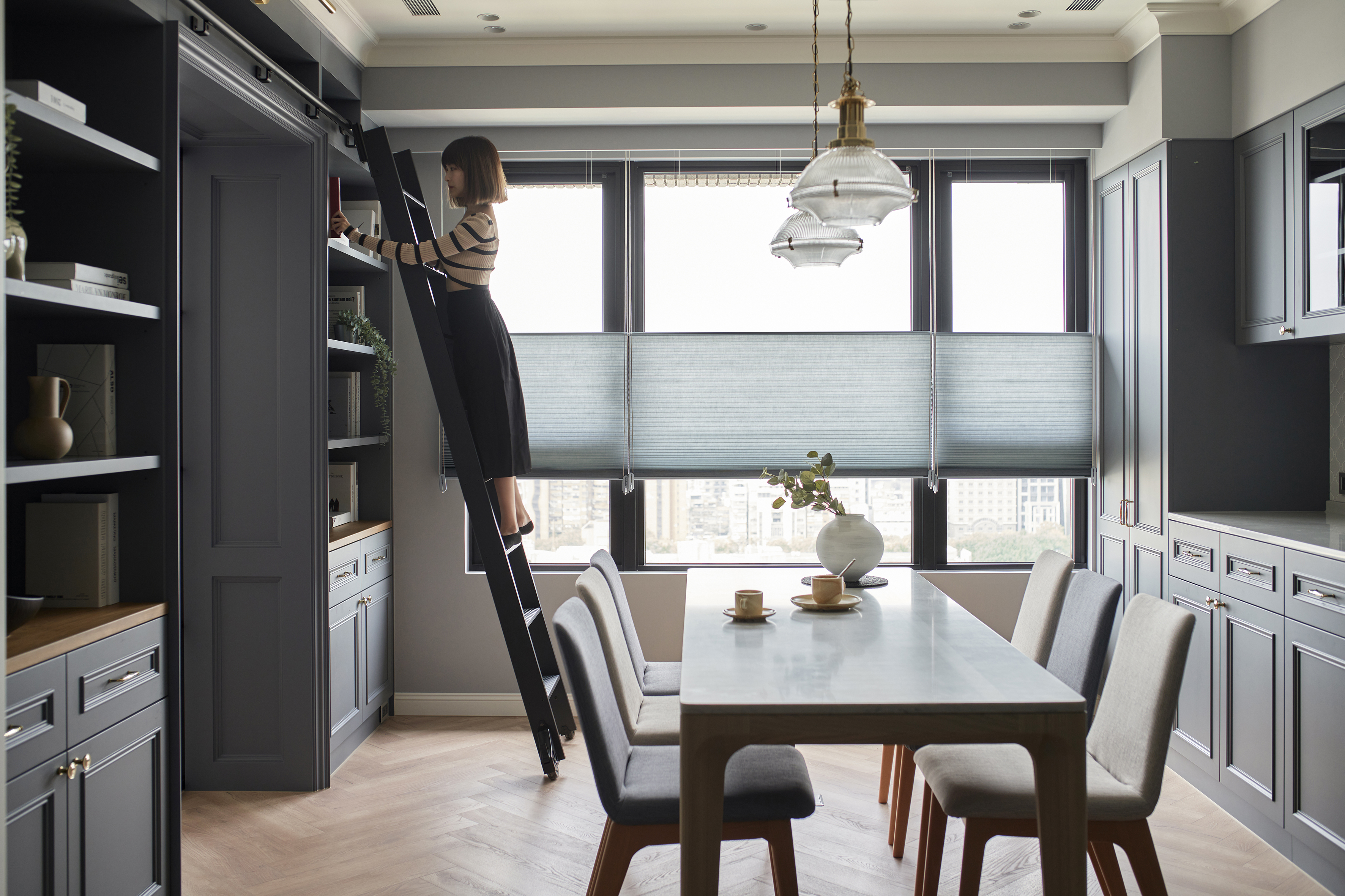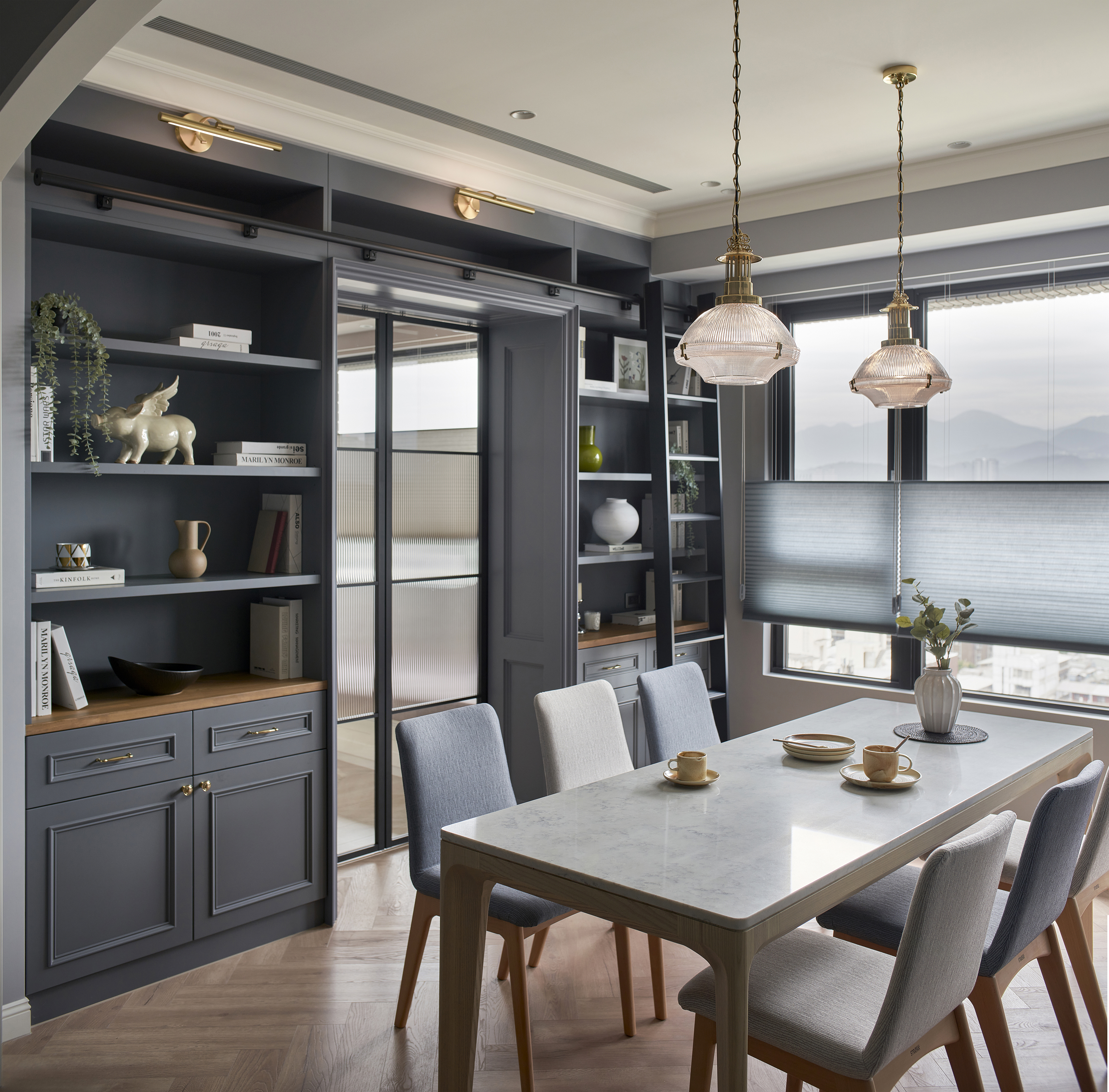 玄關鋪設進口花磚,結合穿衣鏡與鞋櫃機能十足,跳脫制式玄關設計,改採斜角ㄇ字型線性門框擴大場域,進出玄關能沉澱心情,儀式感油然而生,藉此揭開美式生活的序曲。公領域以白色、灰藍色和溫潤的人字拼木地板堆疊舒適溫馨感受,客廳與餐廳相連,加深縱向尺度,簡約線板勾勒出精緻的美式居家輪廓,穿過弧形門拱進入餐廳,窗邊景致遼闊,兩側規劃書牆與收納展示櫃,坪效超放大,穿過玻璃鐵件拉門進入書房,雙人長書桌與窗邊加長型臥榻,讓屋主兩人一起閱讀或放空都輕鬆自在,在柔和色調圍塑的無壓書房,享受彼此的陪伴。