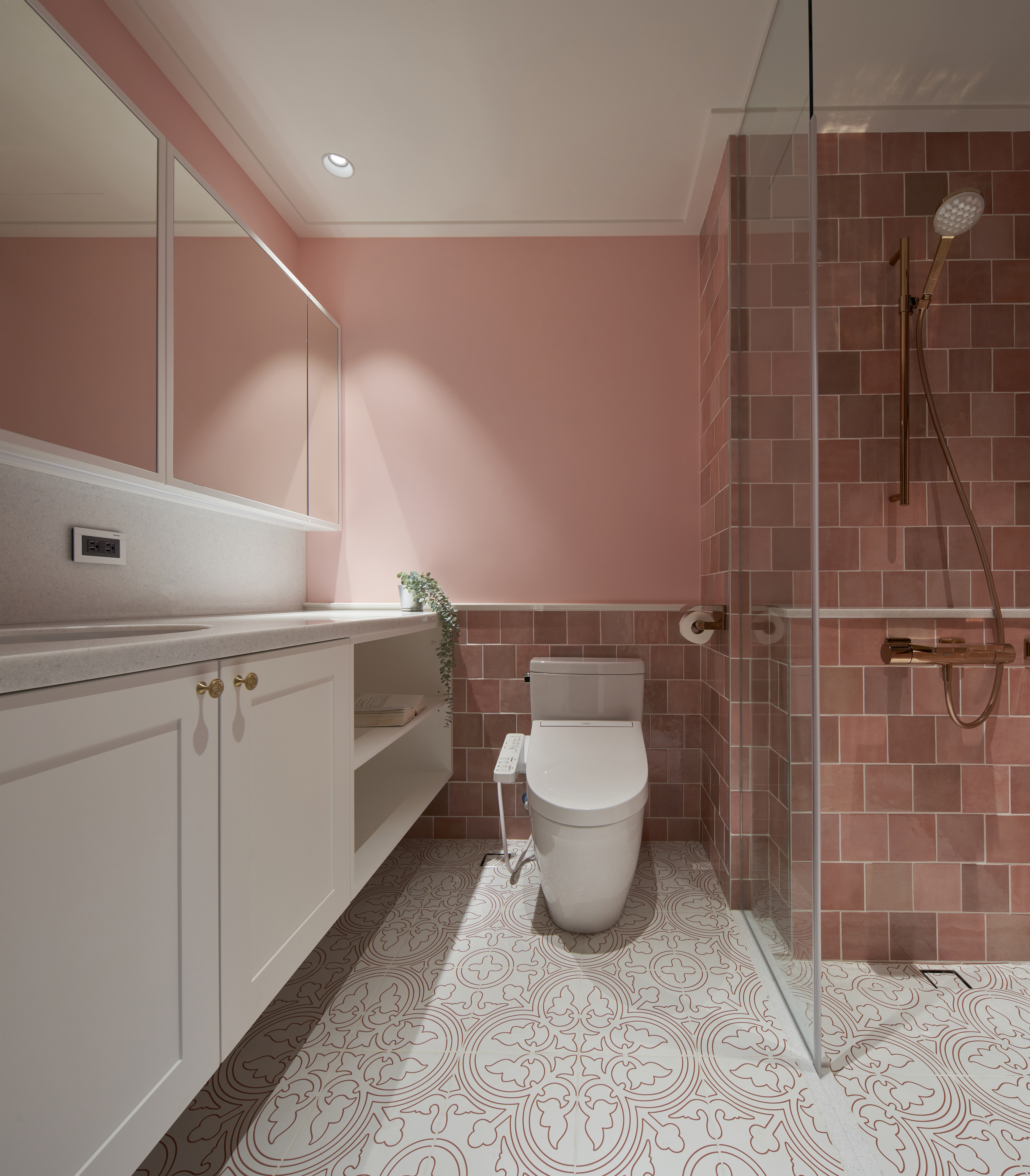 L型廚房料理檯面及動線使用便利,展現時尚明亮的氣息,用愉悅的心情為料理加分。私領域跳色圍塑浪漫情懷,更衣室配備雙排衣櫃,長虹玻璃門片揮別傳統衣櫃的呆板,若隱若現增添美感,又能避免灰塵堆積,主浴以2024 年度Pantone代表色「柔和桃Peach Fuzz」及花磚地坪妝點,將浴室化身為療癒的網美空間。