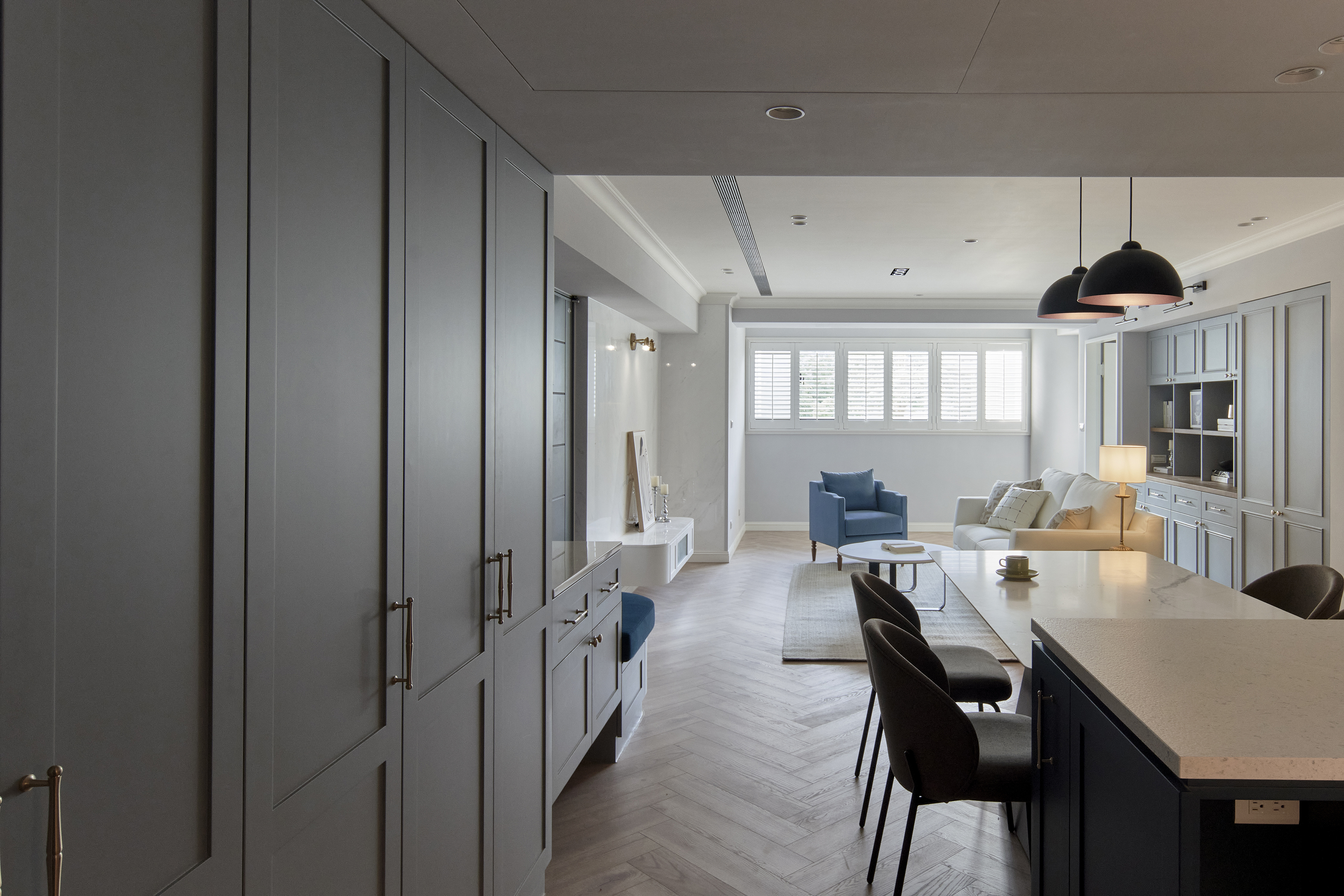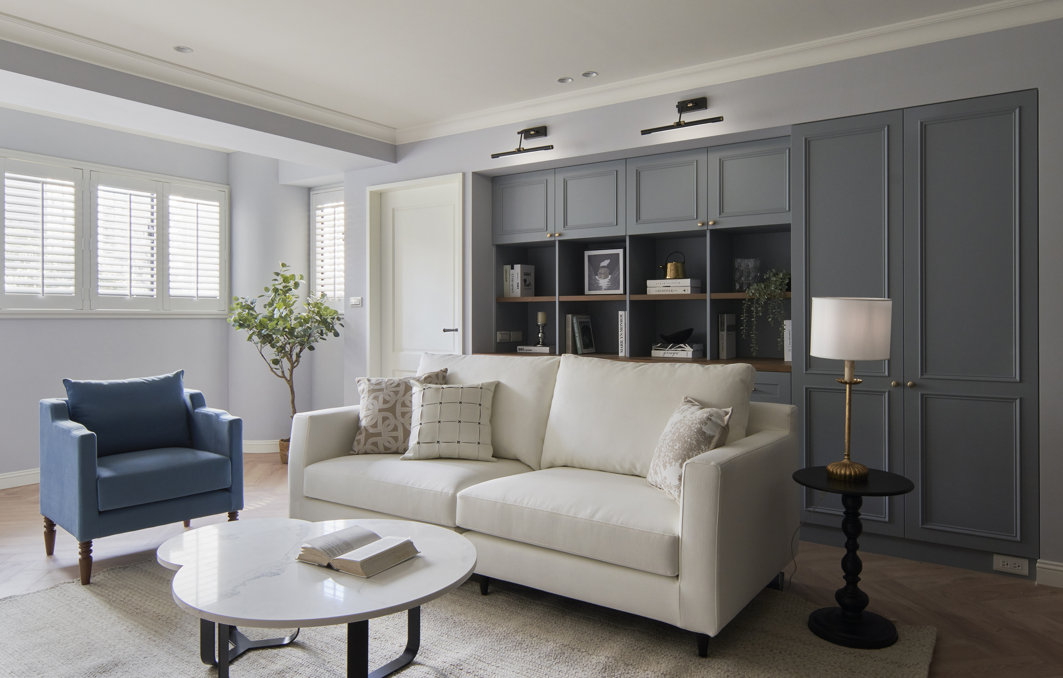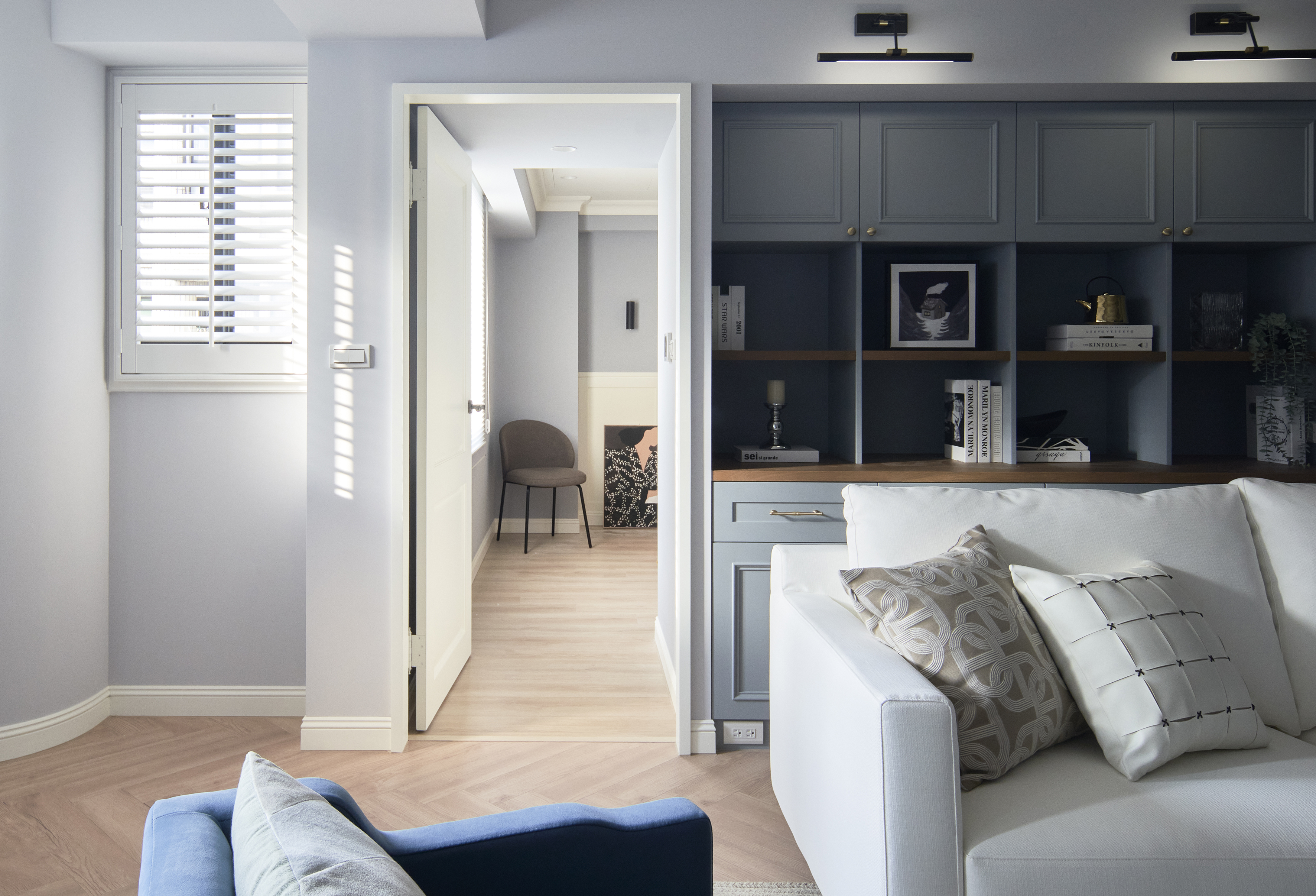 進門後,玄關旁的穿鞋椅及收納櫃體一路延展至餐廳,達到海量收納的效果,物品易於收整,居家不凌亂,美感自然湧現。公領域以客廳、餐廳串聯,開放式設計放大視覺,陽台的日光透過木百葉引入居宅深處,光影灑落創造變化豐富的居家表情,運用輕柔色系與灰藍色深淺搭配,流露一股優雅浪漫感,視覺也具層次感,收納櫃體以線板勾勒經典美式風輪廓,人字拼木地板舖陳異國復古情懷,電視牆石材紋理與壁燈,挹注奢華質感,懸浮電視櫃兩側圓弧設計,增添安全性,餐廳中島結合餐桌圍塑輕食區,適合親友小酌聊天聯絡情感,熱炒區的ㄇ字型廚房寬敞大器,美觀與實用機能兼備。