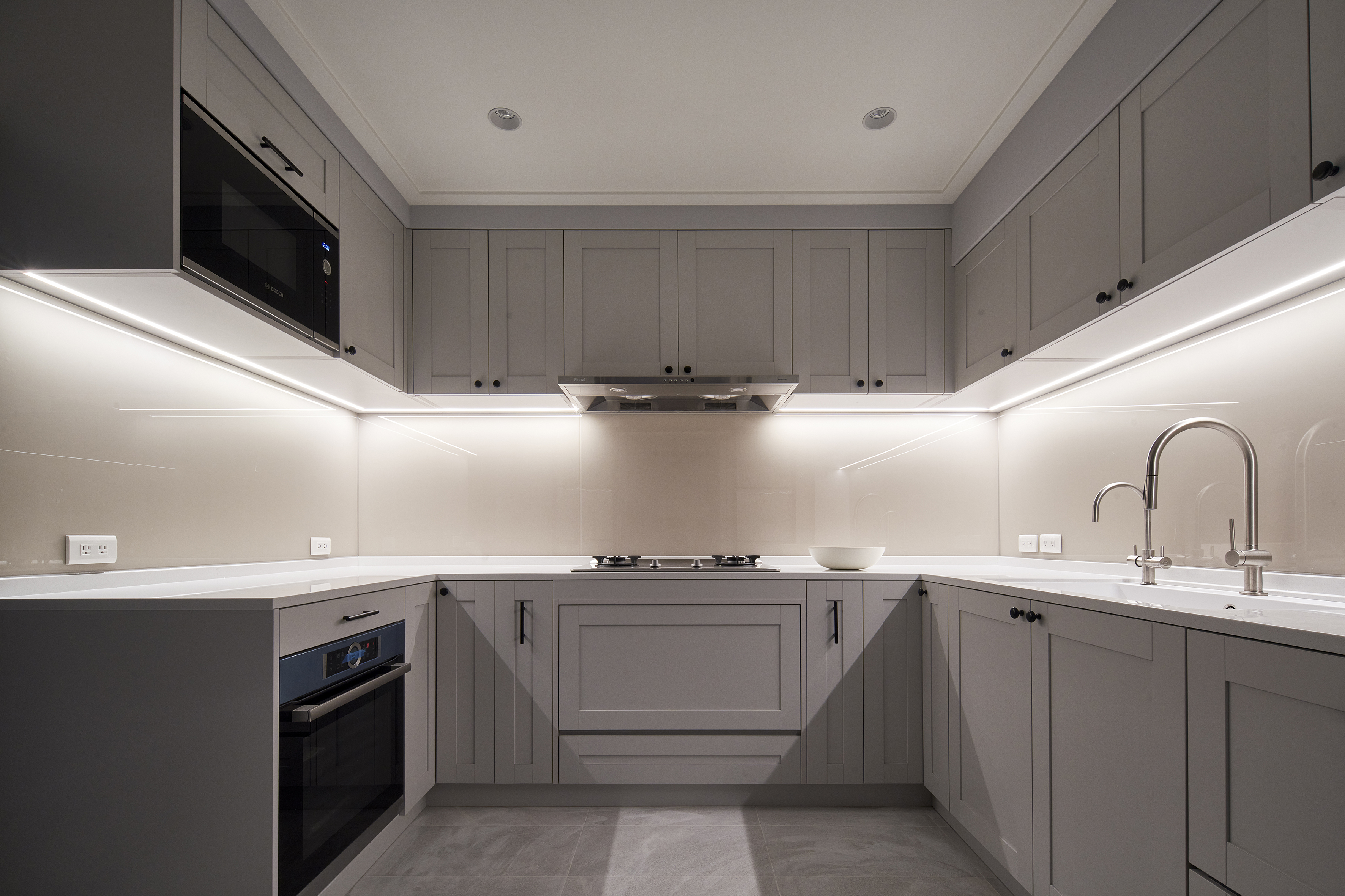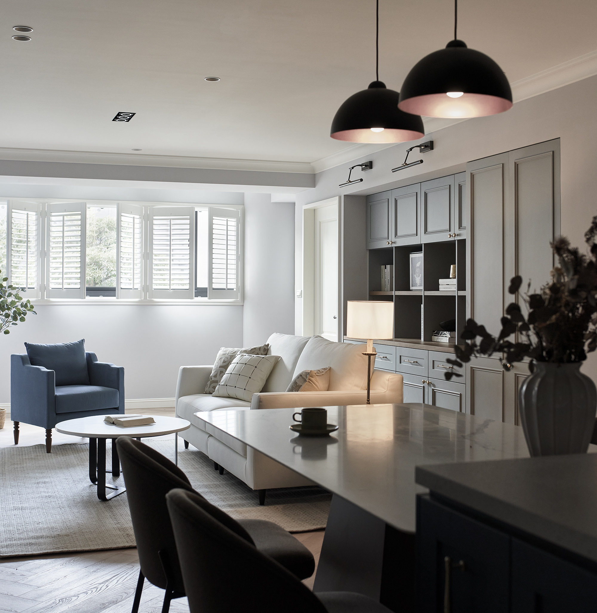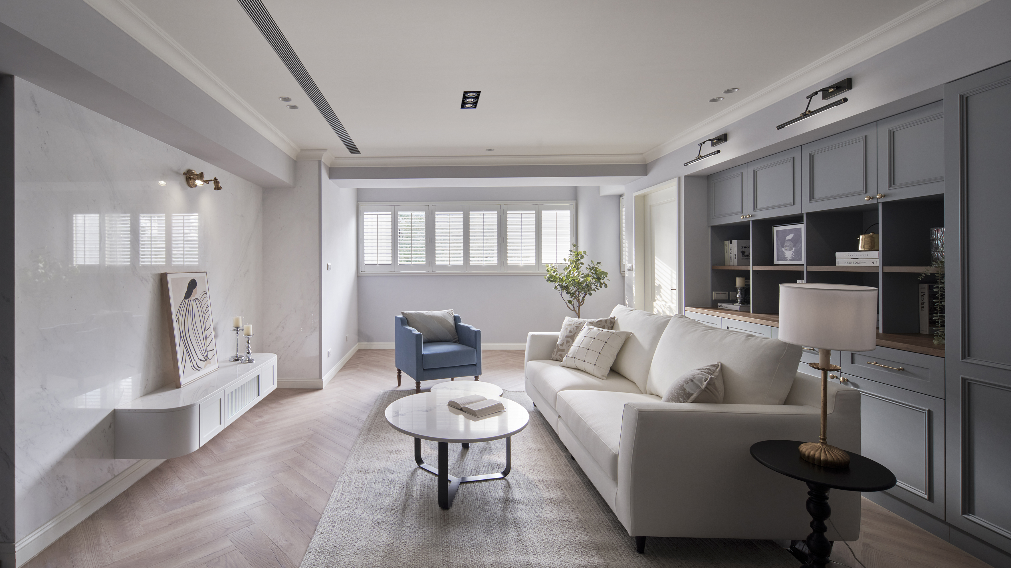 進門後,玄關旁的穿鞋椅及收納櫃體一路延展至餐廳,達到海量收納的效果,物品易於收整,居家不凌亂,美感自然湧現。公領域以客廳、餐廳串聯,開放式設計放大視覺,陽台的日光透過木百葉引入居宅深處,光影灑落創造變化豐富的居家表情,運用輕柔色系與灰藍色深淺搭配,流露一股優雅浪漫感,視覺也具層次感,收納櫃體以線板勾勒經典美式風輪廓,人字拼木地板舖陳異國復古情懷,電視牆石材紋理與壁燈,挹注奢華質感,懸浮電視櫃兩側圓弧設計,增添安全性,餐廳中島結合餐桌圍塑輕食區,適合親友小酌聊天聯絡情感,熱炒區的ㄇ字型廚房寬敞大器,美觀與實用機能兼備。