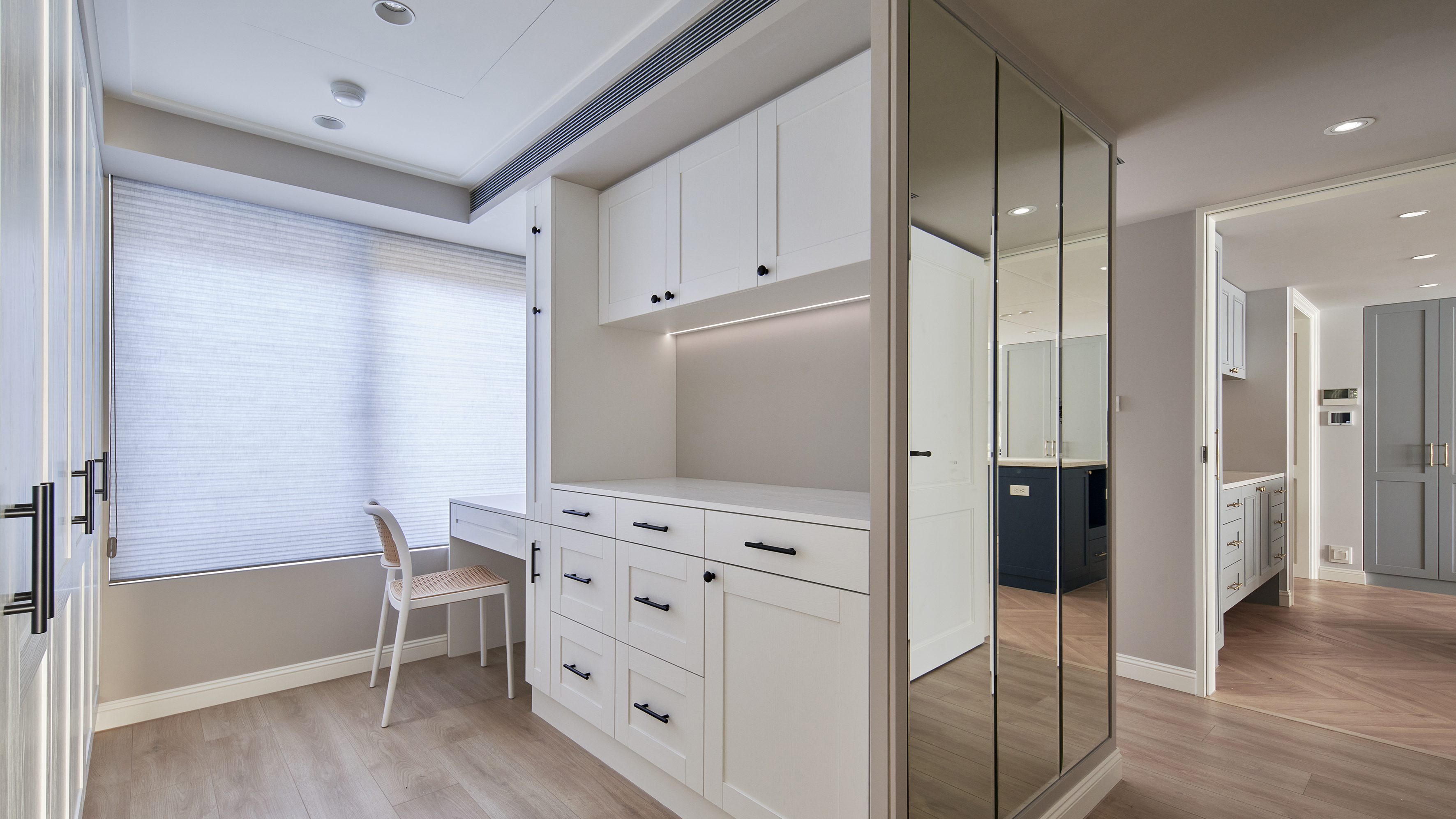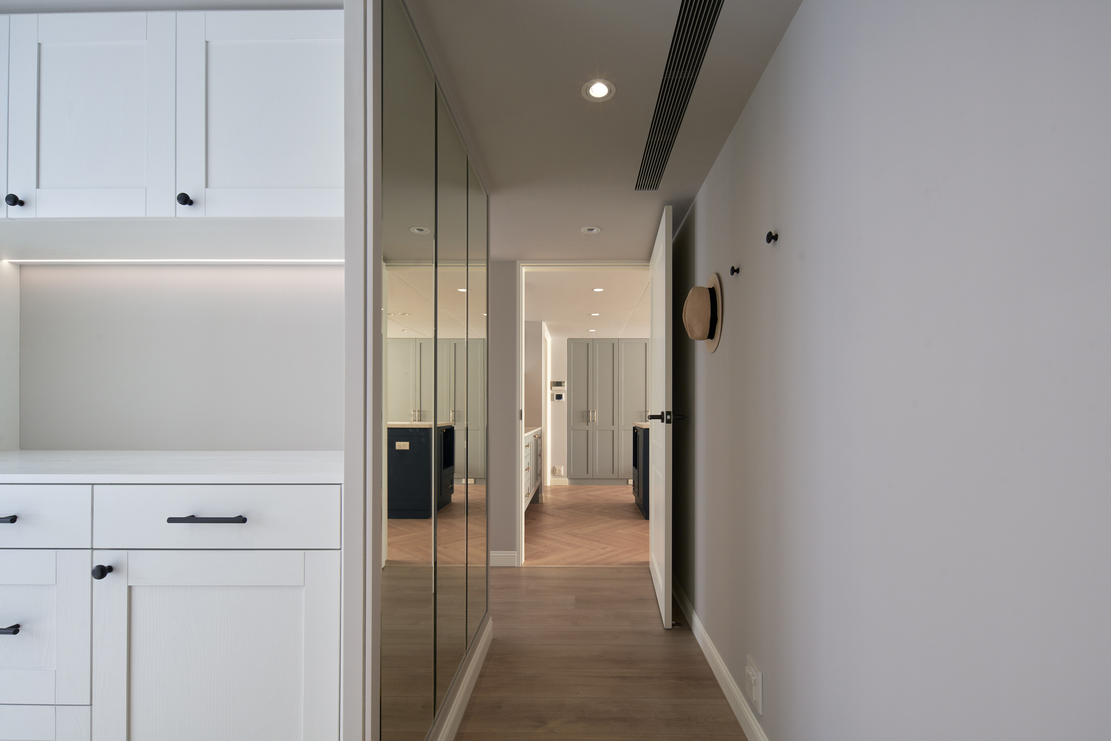 廊道盡頭的收納櫃體立面結合燈條,塑造居家端景。 主臥延續公領域的典雅調性,除了寢臥區外,也納入化妝台、衣櫃及主浴,私領域機能十足。次臥以純淨的白色為基調,樑下空間轉化為更衣室收納,一併解決風水疑慮,櫃體貼上鏡面,讓女主人在家也能享受宛若明星般的更衣室,體現備受寵愛的尊榮感。