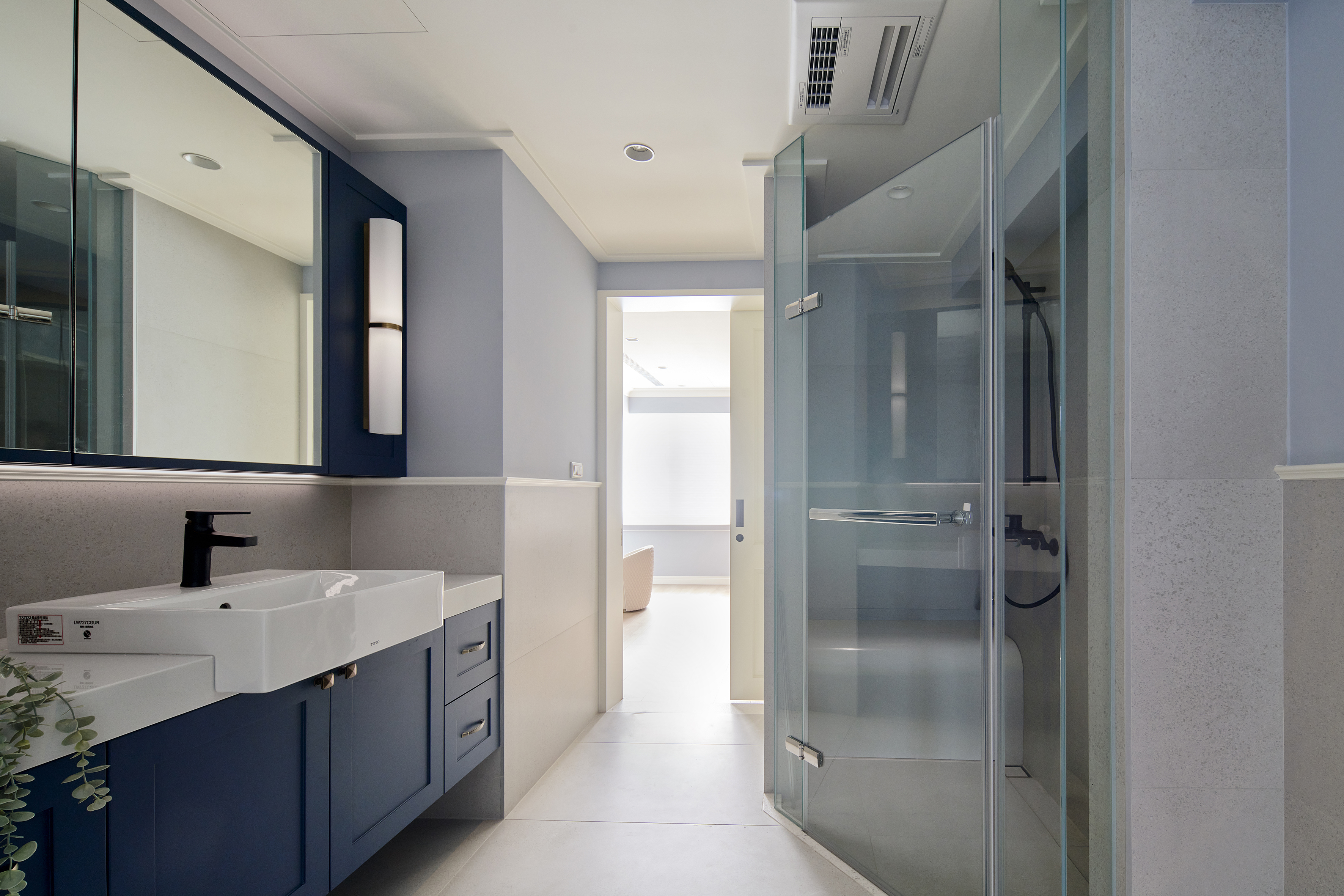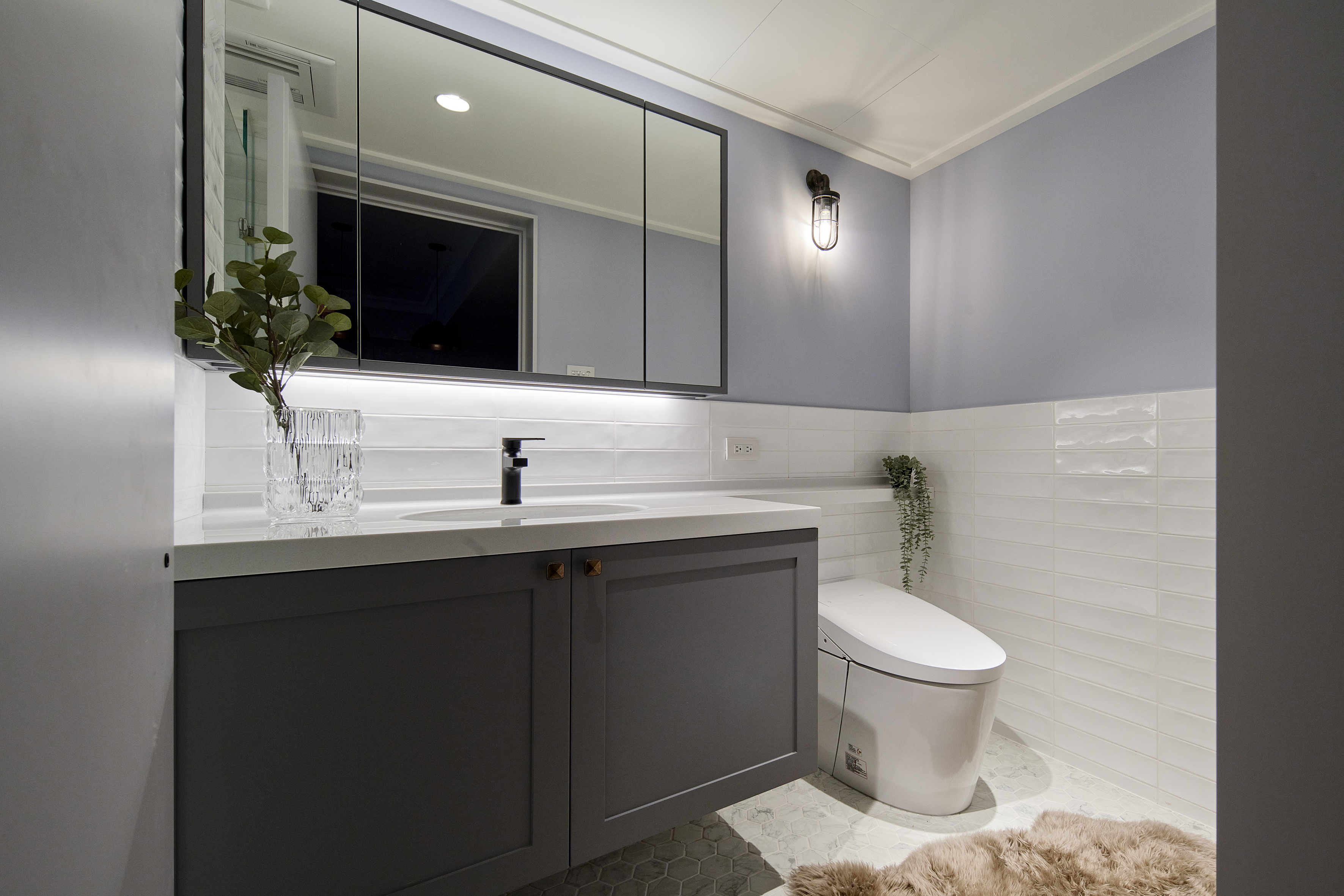 浴室雙色牆面視覺活潑,寬敞的浴廁空間與洗手台,媲美飯店等級的規格,讓人身心舒暢。