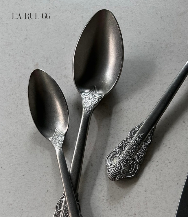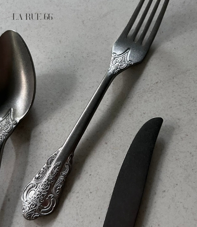 復古工藝美式餐具,材質採用低調的霧面不鏽鋼,呈現雪花銀質地;雅緻的裝飾設計,使餐具樸實而典雅,搭配餐桌擺飾時能給予視覺重量卻又不搶走食物與器皿的焦點,能絕佳的平衡視覺美感。