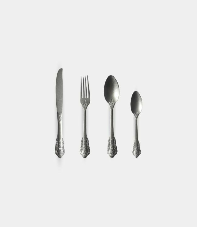 質樸的美式鄉村風餐具,材質採用低調的霧面不鏽鋼,呈現雪花銀質地;弧線設計使餐具更顯簡約優美,搭配餐桌擺飾時能給予視覺重量卻又不搶走食物與器皿的焦點,能絕佳的平衡視覺美感。