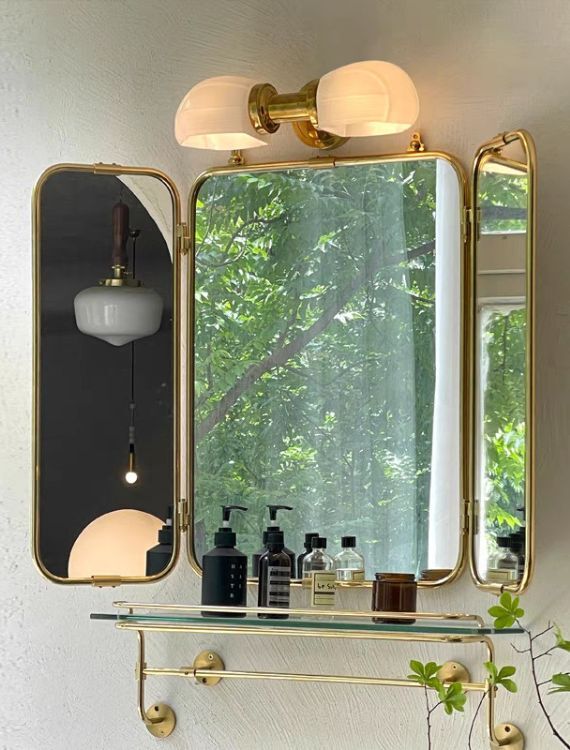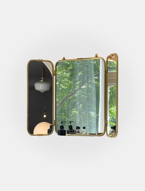 三開式鏡門設計,圓角造型與不鏽鋼金屬邊框,呈現柔和又精緻的復古感。中央鏡面寬敞,兩側鏡門可調整角度,提升梳妝便利性。具有優雅復古與實用機能兼備的設計,適合用於衛浴、化妝區或入口空間。