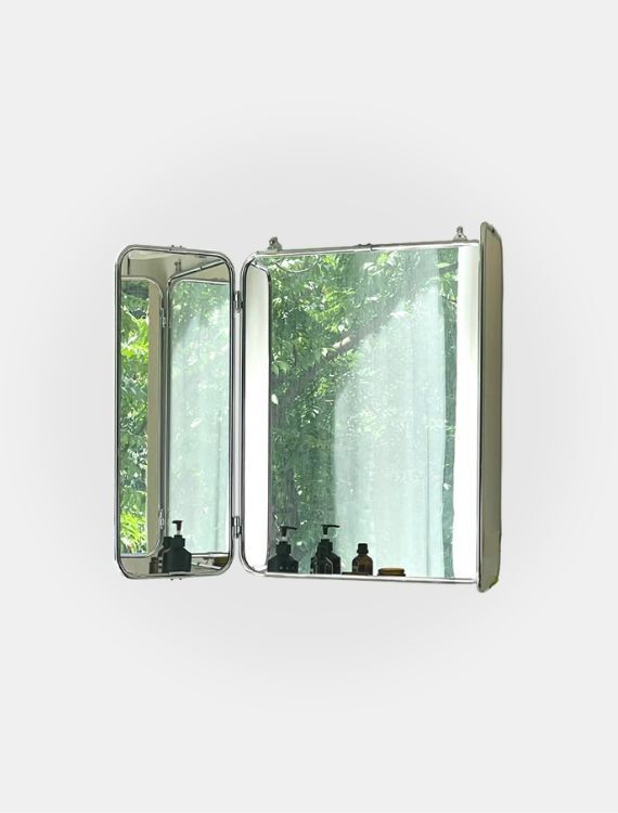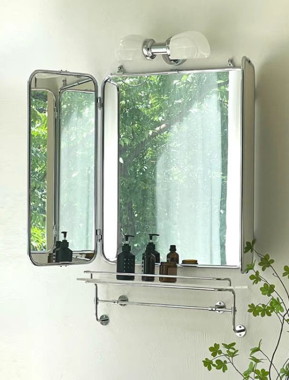 三開式鏡門設計,圓角造型與銀色金屬邊框,呈現柔和又精緻的復古感。中央鏡面寬敞,兩側鏡門可調整角度,提升梳妝便利性。具有優雅復古與實用機能兼備的設計,適合用於衛浴、化妝區或入口空間。