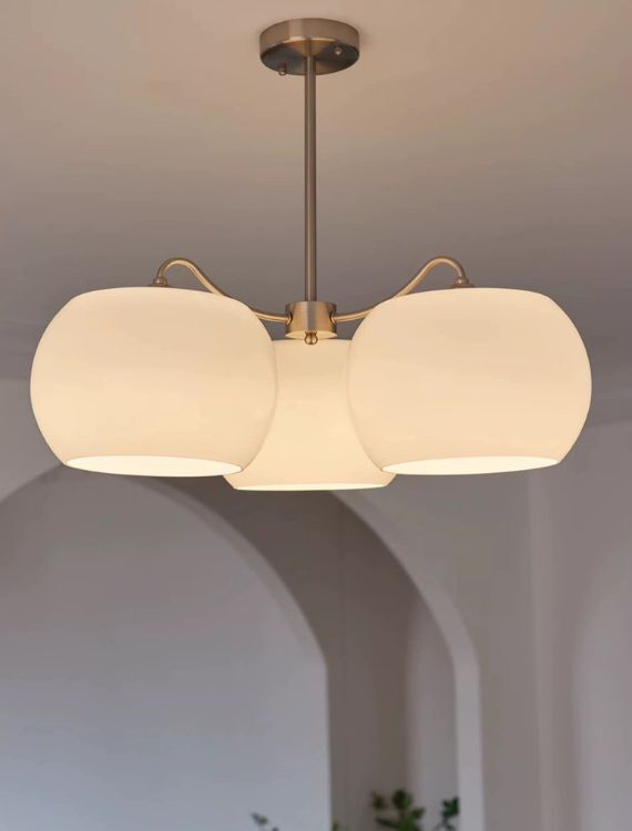 結合復古與極簡現代風格,乳白玻璃燈罩柔化光線,三燈頭設計照明充足,金屬霧金結構展現工藝質感。適合用於客廳、餐桌、書房與商空場域,打造溫潤寧靜氛圍。