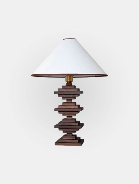 靈感源自現代建築結構與積木造型,這款檯燈以層疊實木構件堆疊出立體幾何感。燈座選用質感細膩的白蠟木,以深棕色塗層展現摩登與穩重氣質。搭配優雅的布藝燈罩與細緻金屬接頭,散發柔和光感。內建三段色溫切換功能,可依需求切換暖光、自然光與白光,兼具設計感與實用性,適合放置於臥室、書房或現代風格空間中。