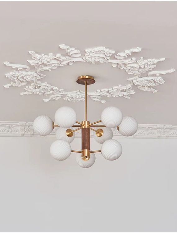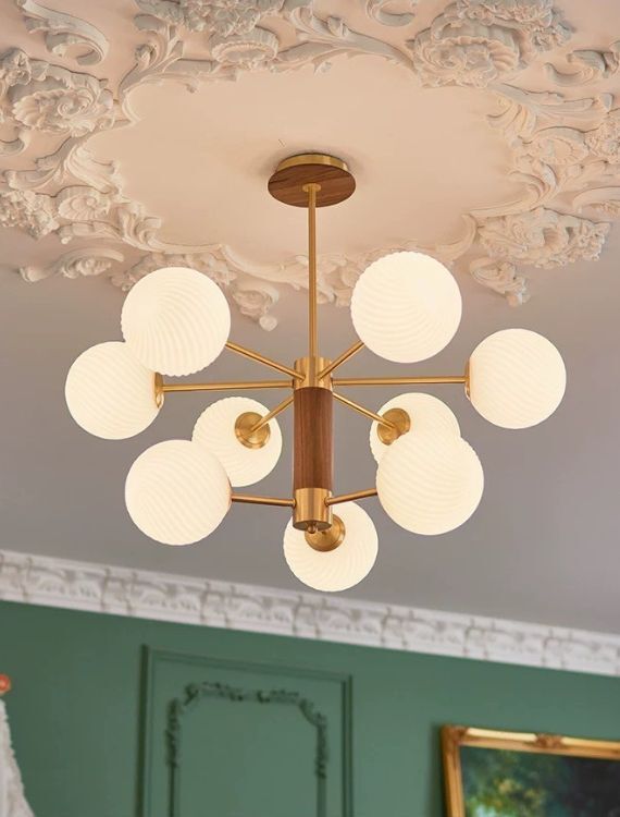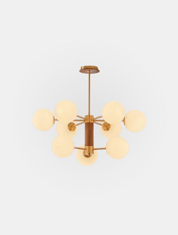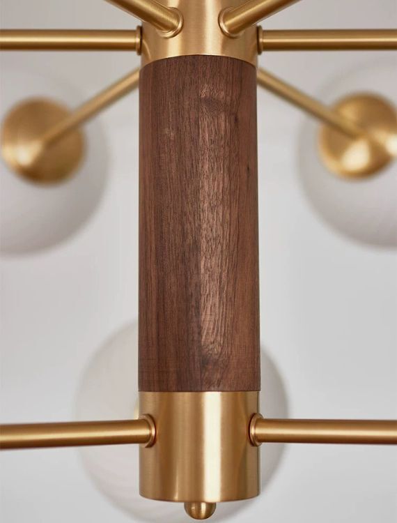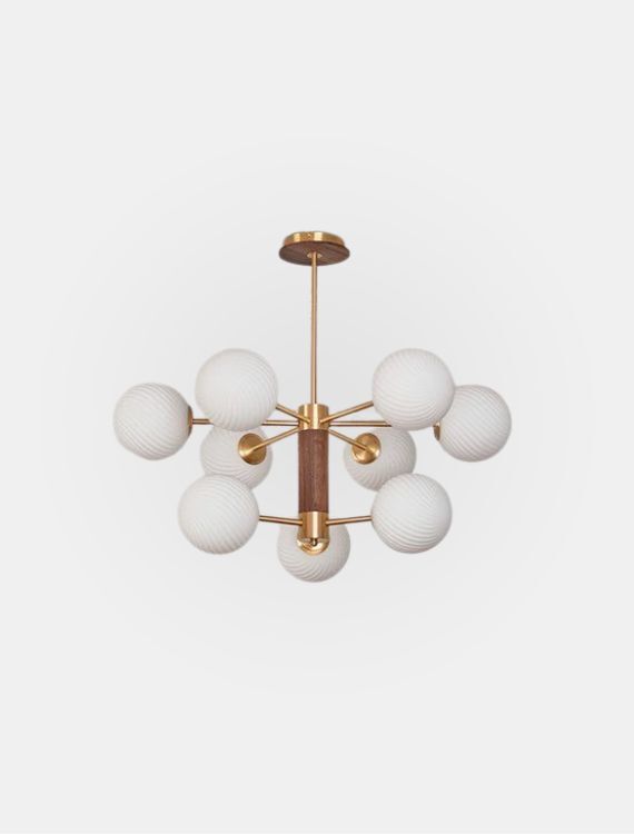 結合黃銅、胡桃木與陶瓷三種材質,展現溫潤的現代復古感。九顆球形燈罩帶有細緻螺旋紋理,光線柔和不刺眼。黃銅配件經封油處理可抗氧化,搭配木質主幹更顯質感。預設吊桿長度20cm,可訂製調整,適合餐桌、客廳、高挑空間等,兼具裝飾與實用性。