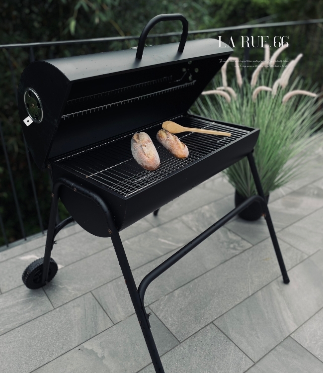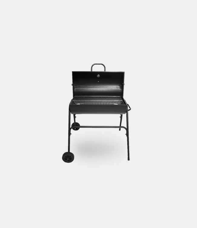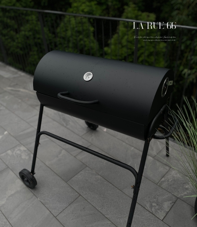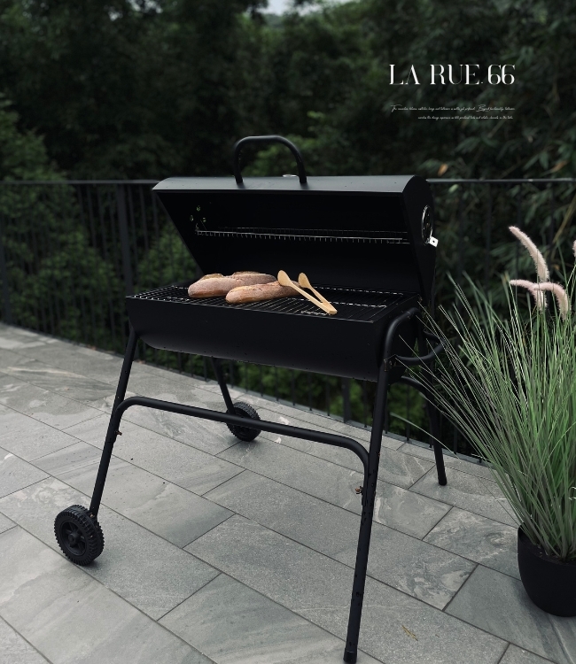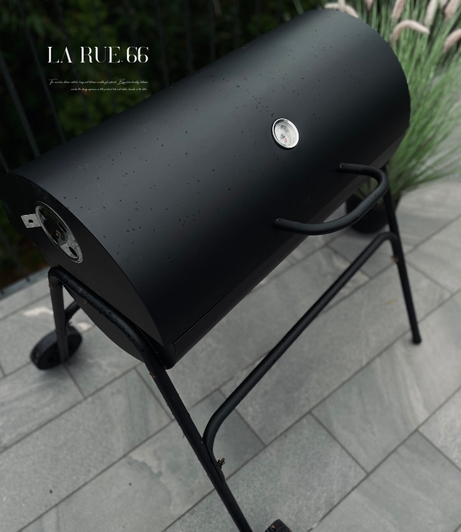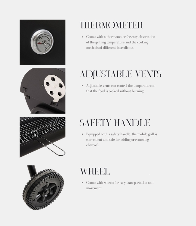 美式霧面沉穩黑合金鋼,如紳士般的優雅設計;本產品已通過歐盟CE、法國DGCCRF和德國LFGB認證;主體表面塗層為耐350℃的環保高溫粉或高溫漆,加上可調節式通風口與溫度計,可把控溫度使食材烤熟而不焦;並配備安全把手與PP移動輪,讓您的戶外燒烤體驗優雅且安全的進行。