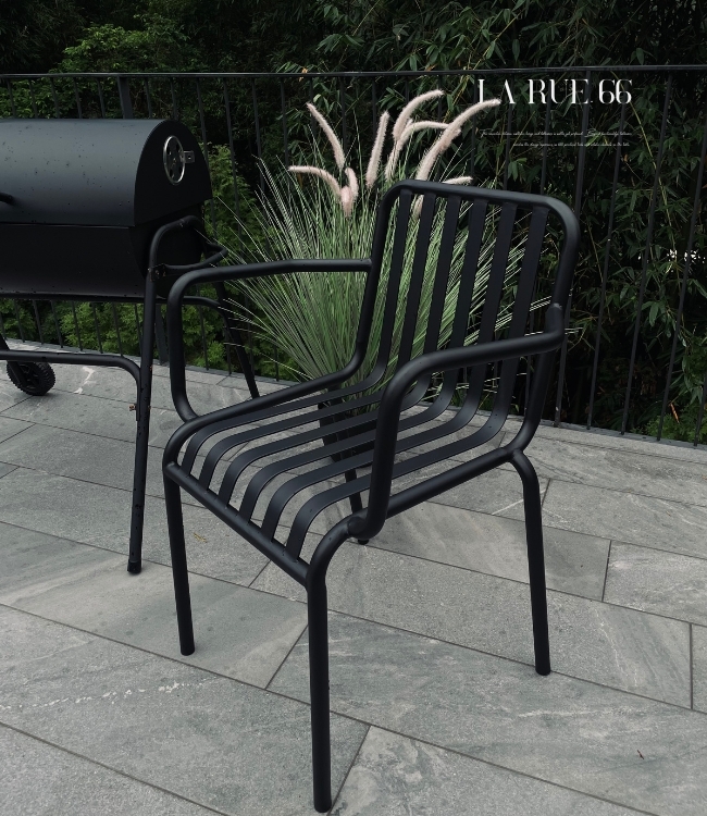 經典美式霧黑鐵椅;以符合人體工程學的流線設計,選用高品質鐵件工藝,耐腐蝕且穩固;加裝扶手以及椅面條狀簍空的設計,讓乘坐者舒適透氣。