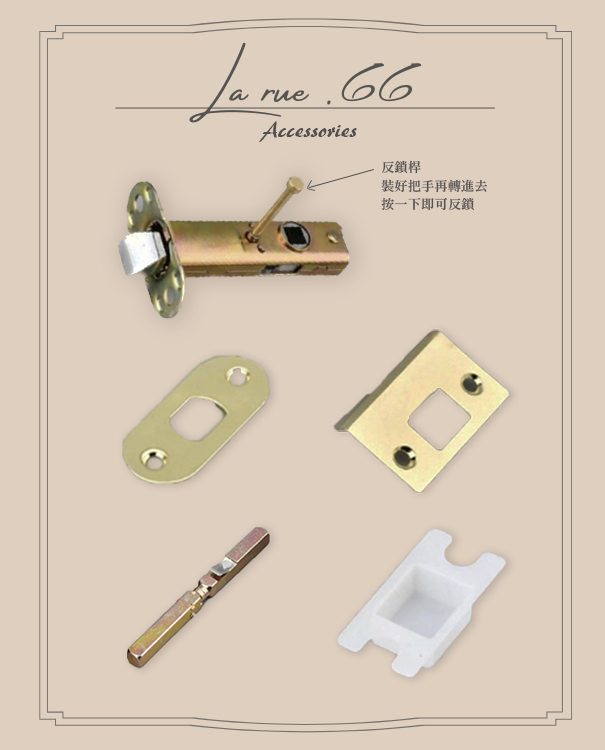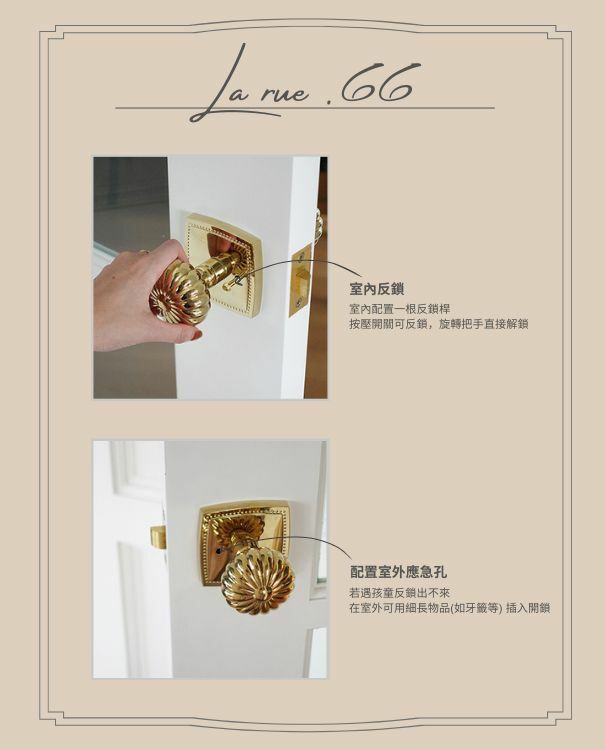 · 可室內反鎖,室內配置一根反鎖桿,按壓開關可反鎖,旋轉把手直接解鎖