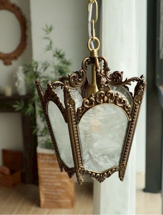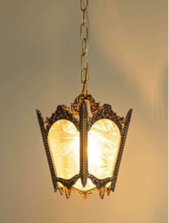 以封油黃銅打造華麗細節,搭配冰花玻璃燈罩,透出柔和光影,營造高雅浪漫氛圍。仿古雕飾與拱形造型展現18世紀洛可可風格,極具裝飾性與藝術感。適合玄關、樓梯、閱讀角落等空間,吊鍊長度可調整,靈活搭配不同天花板高度,兼具實用與美感。
