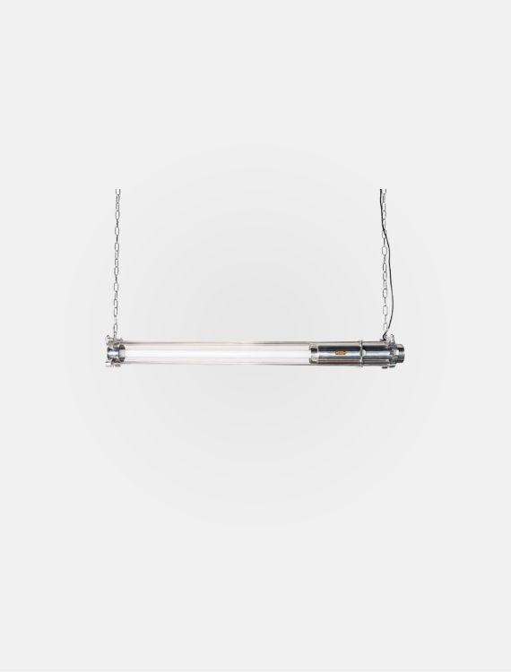 以工業風為設計核心,採用細長圓管燈體,搭配金屬鍊條極具機械感。透明燈罩設計突顯內部結構細節,具備強烈視覺張力與功能性照明效果。適合用於工作室、廚房中島、潮流商空等需要光線均勻且風格鮮明的空間,為室內注入現代工業美學。