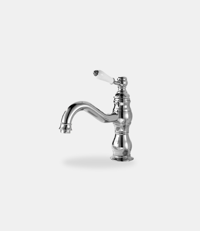 法式古典白陶瓷握柄水龍頭融合了優雅的設計和現代工藝。白陶瓷握柄展現古典美感,銀色電鍍黃銅材質增添奢華感和耐用性。電鍍黃銅具有抗腐蝕和耐磨損特性,適合各種風格的浴室或廚房,為空間增添高雅氣息。