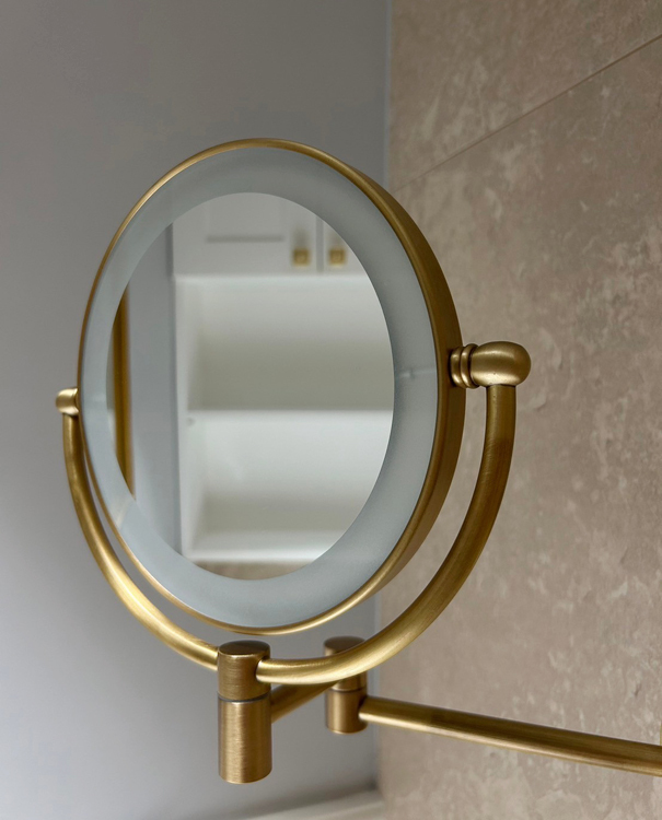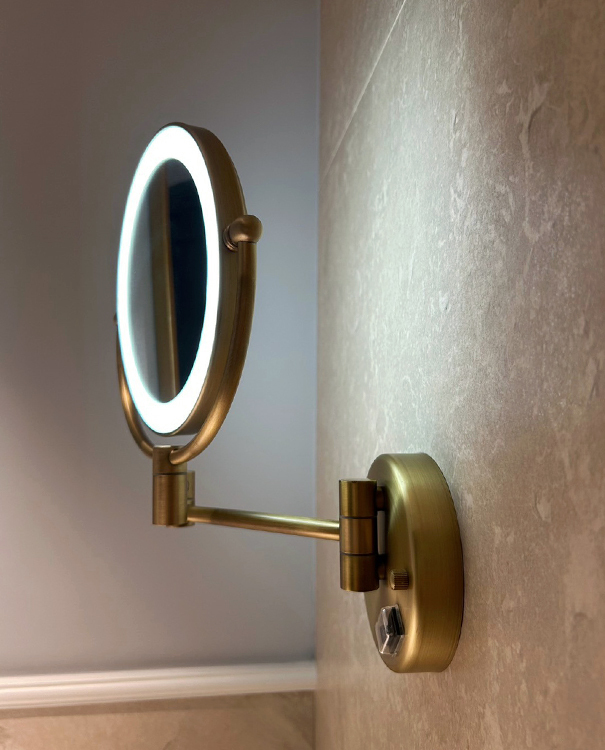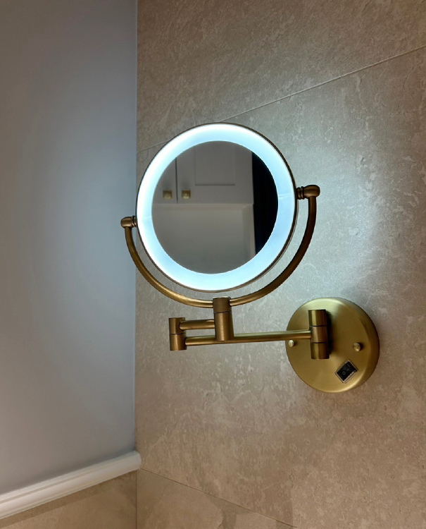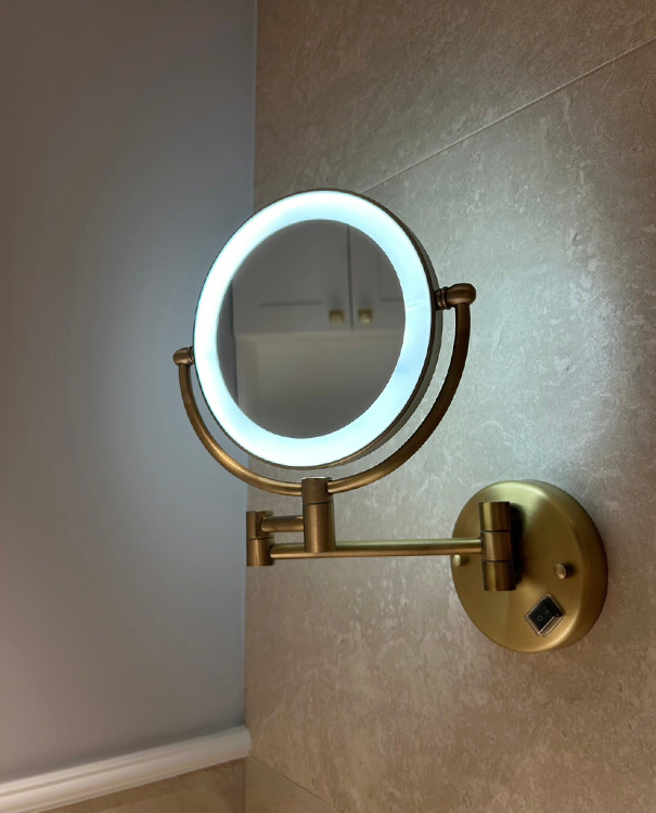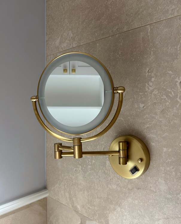 充滿歐式氛圍感的壁掛式伸縮化妝鏡,實用的雙面設計,自帶LED燈光,鏡子可360度旋轉,造型風格現代簡約,無論是浴室、臥室還是化妝間,都能完美融入各種家居風格,提升空間格調。