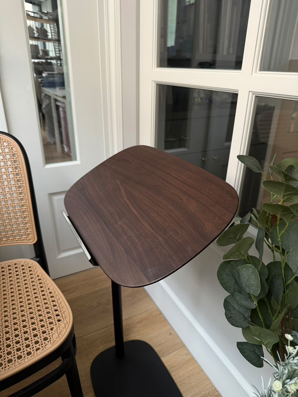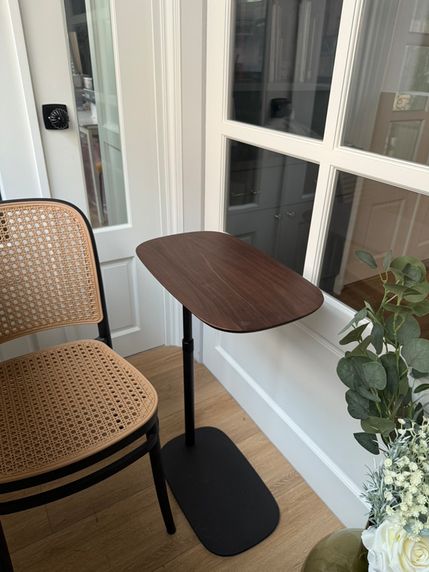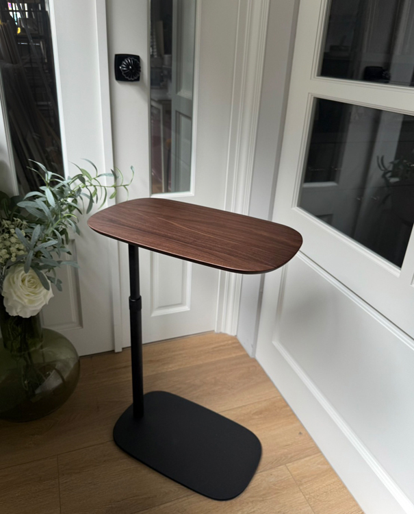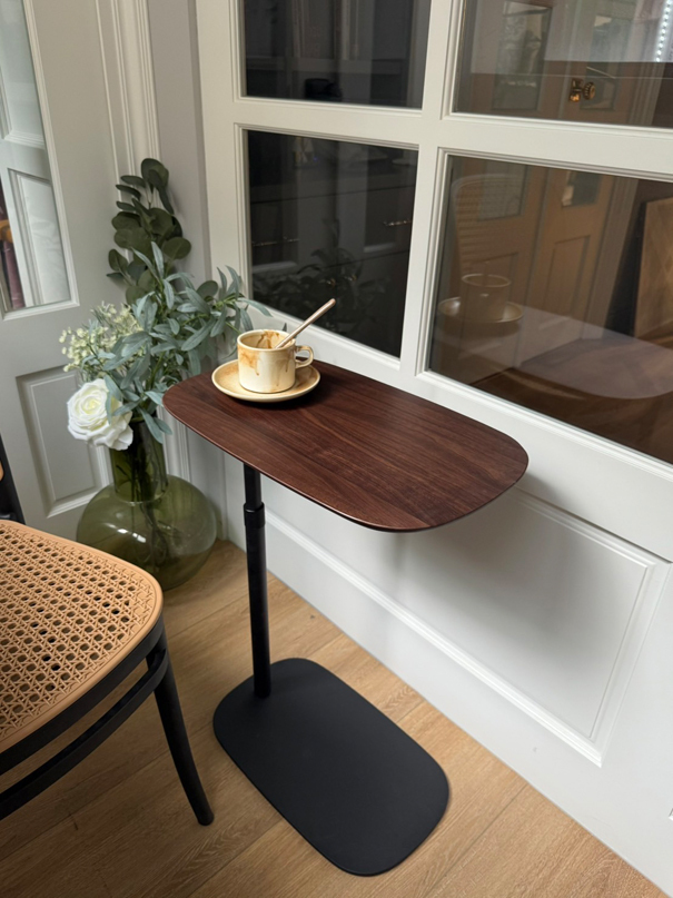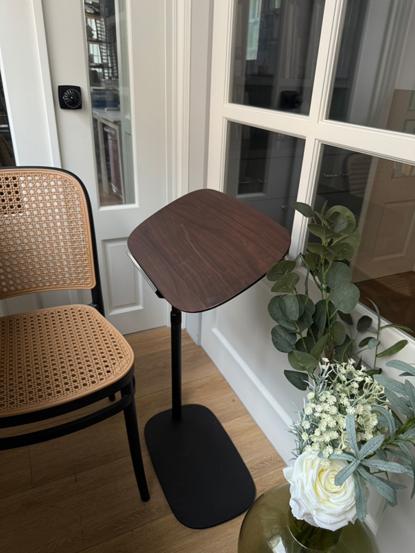 可調角度與高度的邊桌,結合實木桌面與霧黑不鏽鋼腳座,展現穩重且富現代感的質地