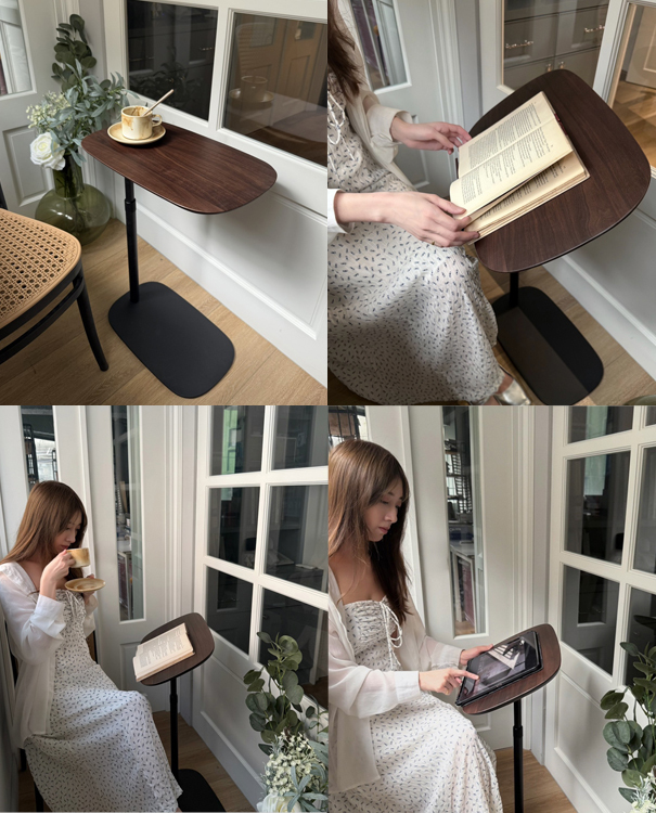 · 可調角度與高度的邊桌,結合實木桌面與霧黑不鏽鋼腳座,展現穩重且富現代感的質地