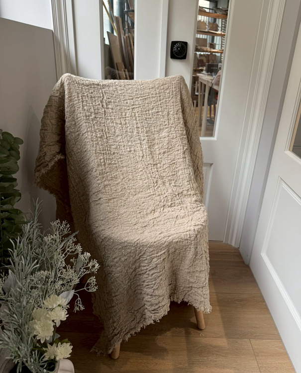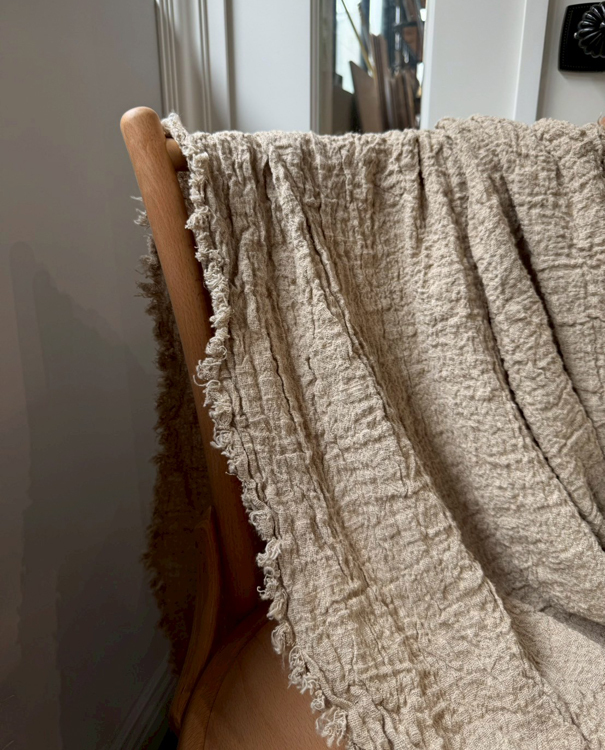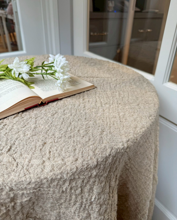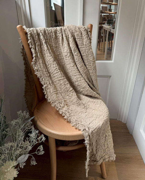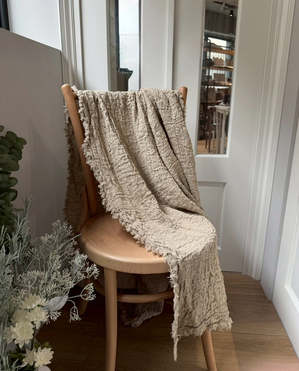 自然皺摺紋理與手感,展現溫潤樸實的生活美學。多用途設計可用作桌巾、蓋布、圍巾或攝影背景,提供多種居家搭配靈感。共有三種尺寸可選,滿足不同使用需求。