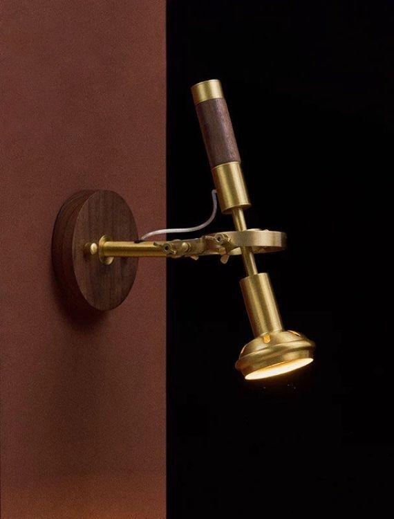 · 靈感取自精密機械結構,以黃銅與胡桃木打造,靈活關節設計,可自由調整照射角度
