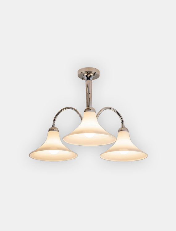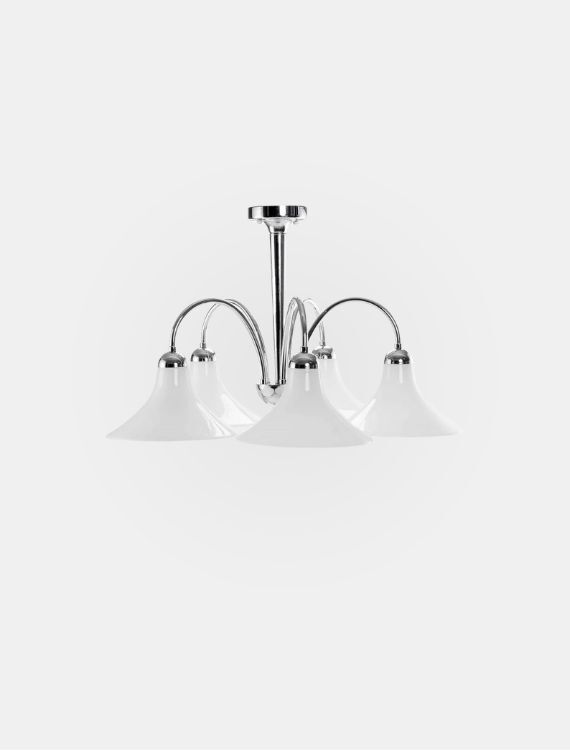 採現代簡約風格,結合拋光金屬材質與流線型設計,展現俐落而優雅的氛圍。燈罩以柔和白色玻璃打造,曲線造型如盛開花瓣,增添一絲柔美感。適合搭配現代、北歐或輕奢風格空間,能為客廳、餐廳營造溫潤且明亮的視覺效果。