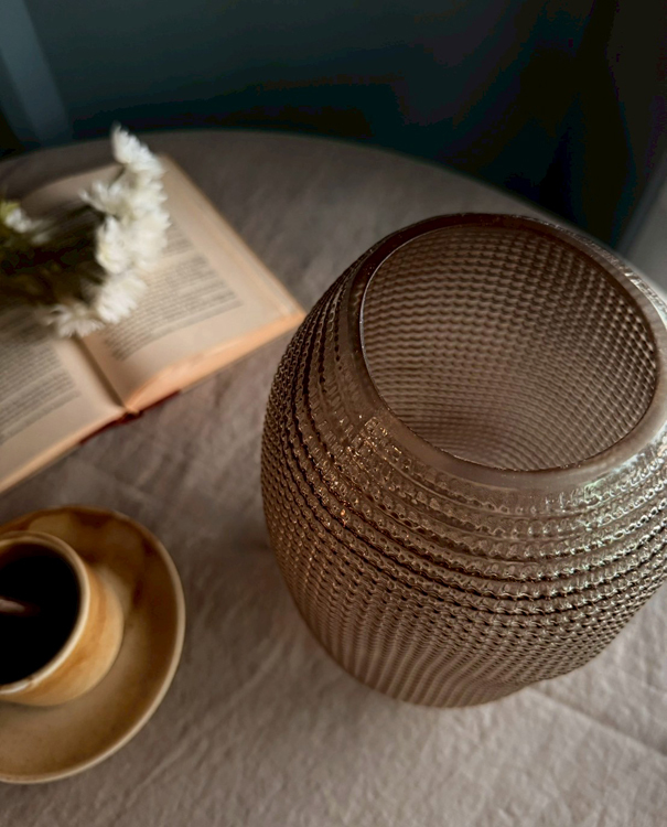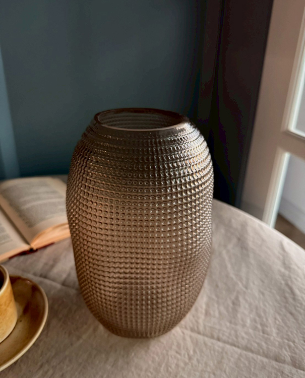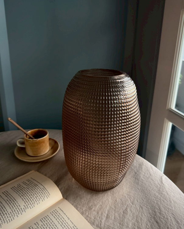 · 霧面琥珀玻璃製成,瓶身以細膩格紋呈現獨特觸感與波紋光影效果,融合現代感與工藝氣息