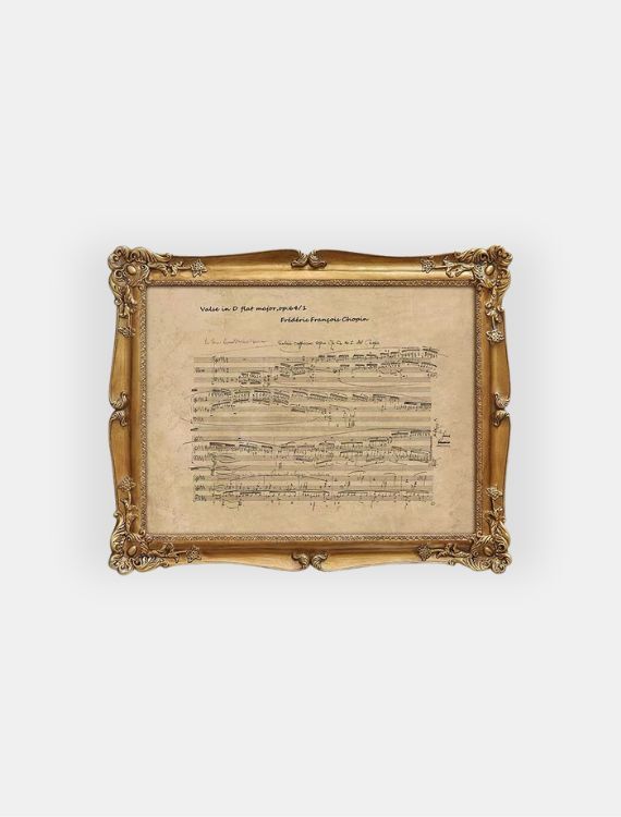 以經典手稿樂譜為主題,呈現細緻的筆觸、墨跡與年代感,彷彿將音樂家的創作瞬間凝結在畫框之中。採用復古感強烈的樹脂雕花框,搭配油畫棉布質地,更凸顯整體的歷史韻味與收藏質感。兩款樂譜可單掛亦可成雙陳列,讓空間多一份文藝與歐系家居的典雅氛圍。無論放置於書房、工作室或客廳,都能為日常增添靜謐而高雅的音樂氣息。