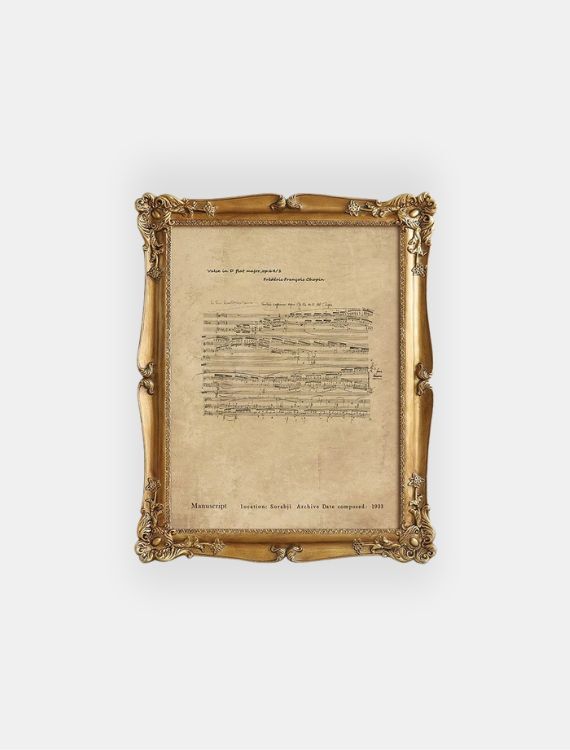 以經典手稿樂譜為主題,呈現細緻的筆觸、墨跡與年代感,彷彿將音樂家的創作瞬間凝結在畫框之中。採用復古感強烈的樹脂雕花框,搭配油畫棉布質地,更凸顯整體的歷史韻味與收藏質感。兩款樂譜可單掛亦可成雙陳列,讓空間多一份文藝與歐系家居的典雅氛圍。無論放置於書房、工作室或客廳,都能為日常增添靜謐而高雅的音樂氣息。