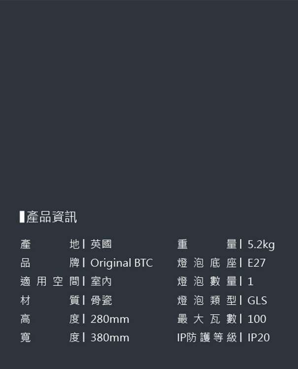 Original BTC在位於英國工業大城伯明翰的金屬加工廠,運用百年傳統工藝技術,將鋁、紅銅、黃銅等原始材料經手工焊接、塑型、拋光及相關表面處理製程,創造出純粹細緻的金屬燈飾。