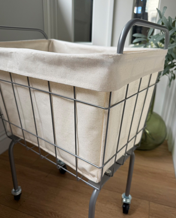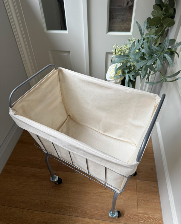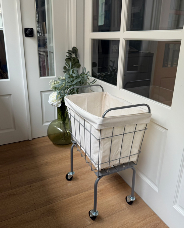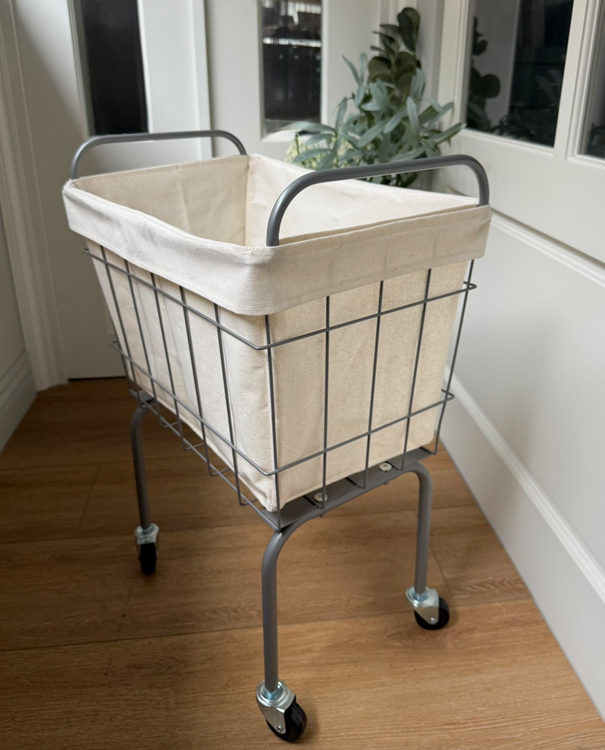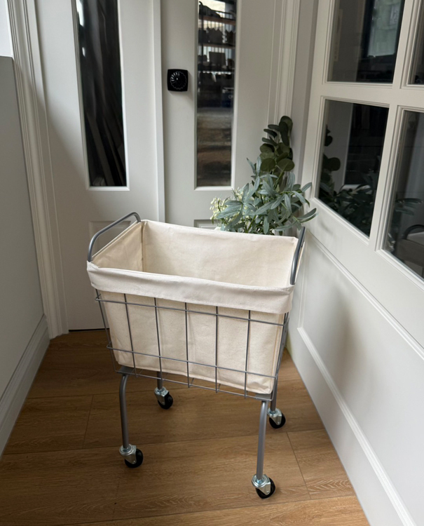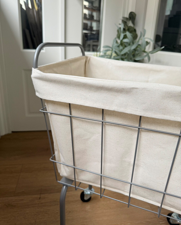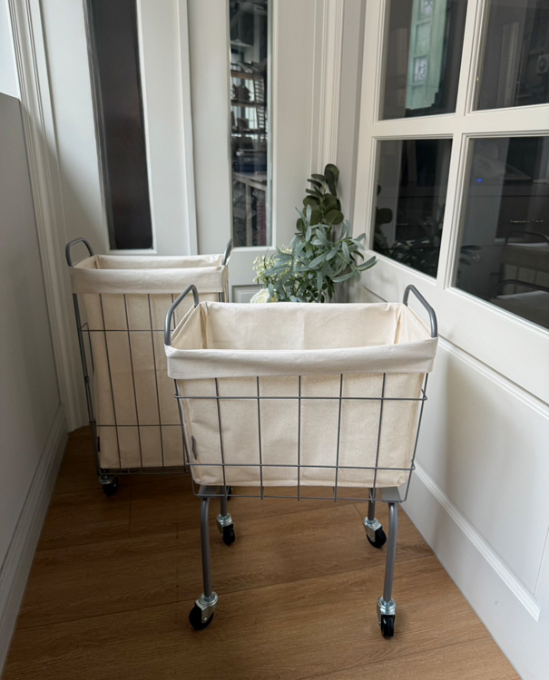 金屬籃架搭配米白防水帆布內袋,簡約耐看,四輪設計靈活移動,適合用於洗衣、雜物整理或小空間收納,兼具實用與工業風格美感