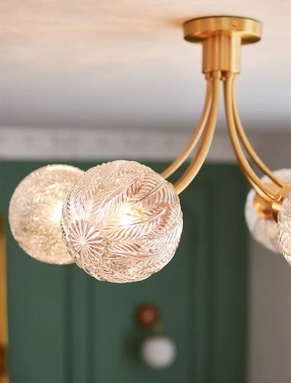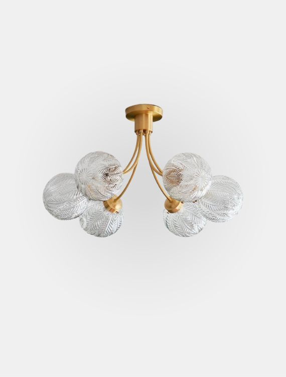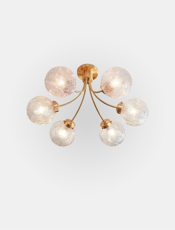 以六顆球型壓花玻璃燈罩搭配黃銅金屬支架(封油處理),展現優雅復古氣質,適合客廳、餐廳、挑高空間。玻璃紋理折射光影,營造溫潤復古氛圍,兼具美感與實用性。