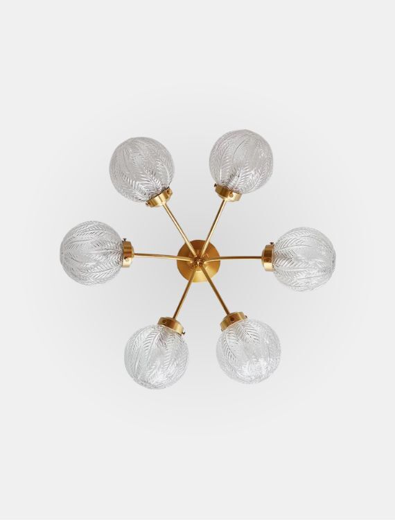 · 以六顆球型壓花玻璃燈罩搭配黃銅金屬支架(封油處理),展現優雅復古氣質